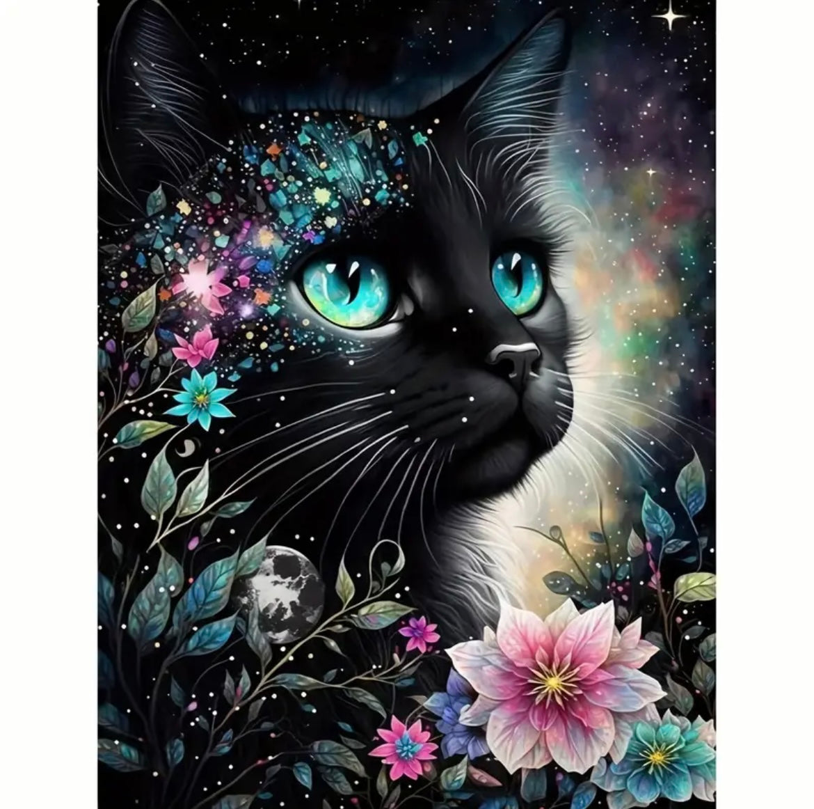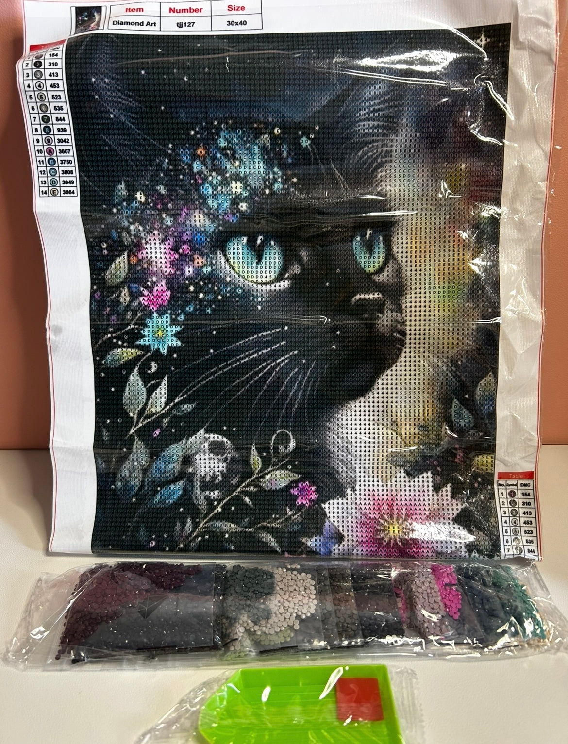 30x40cm diamond painting kit with a stunning floral black cat design.