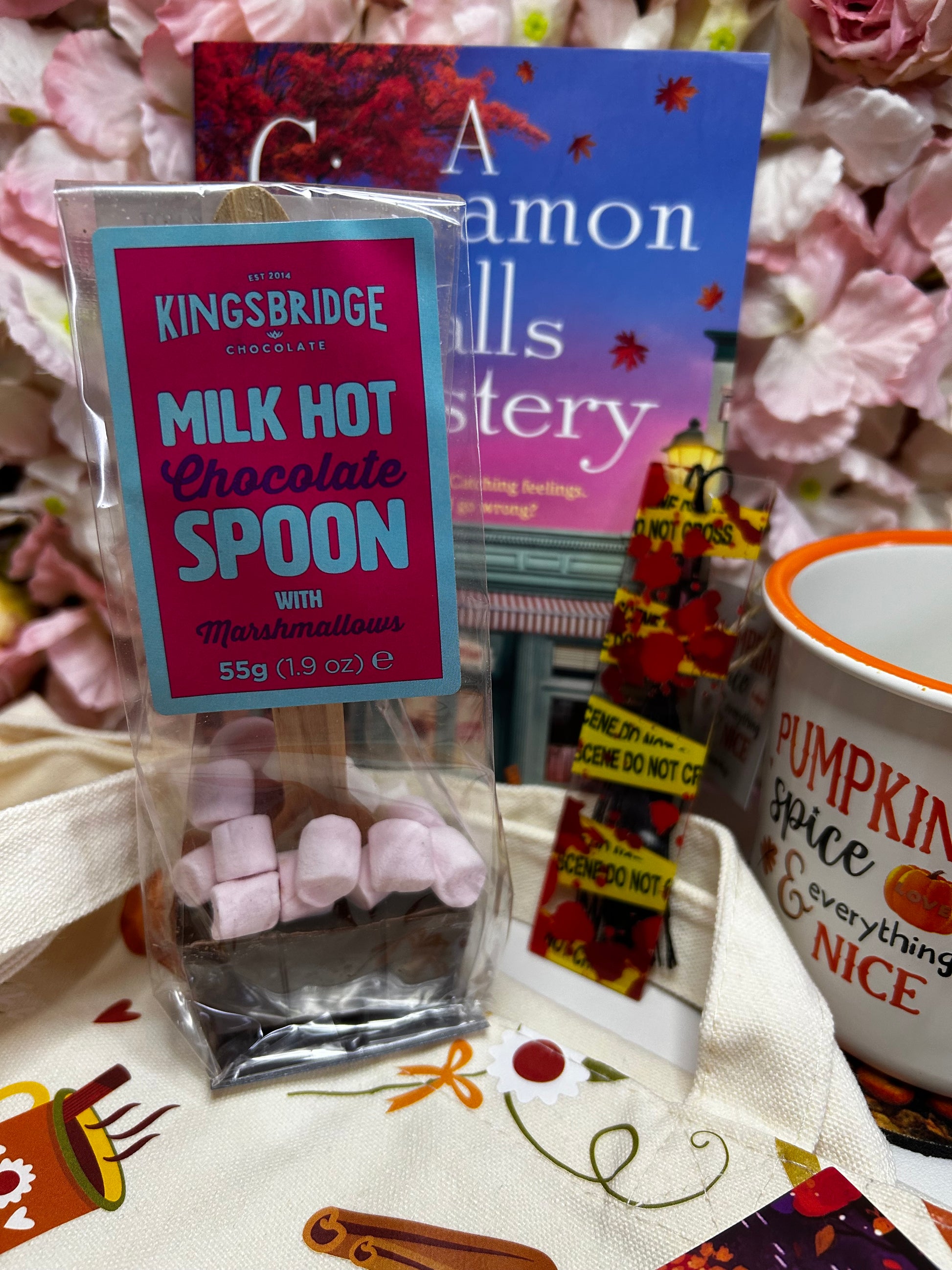 Get ready for autumn with this charming book box! It includes a fiction book, "A Cinnamon Falls Mystery,” Enamel pumpkin mug, cute tote bag, themed acrylic bookmark, coaster and card bookmarks. There is also a hot chocolate spoon included to get you in the autumn feels.