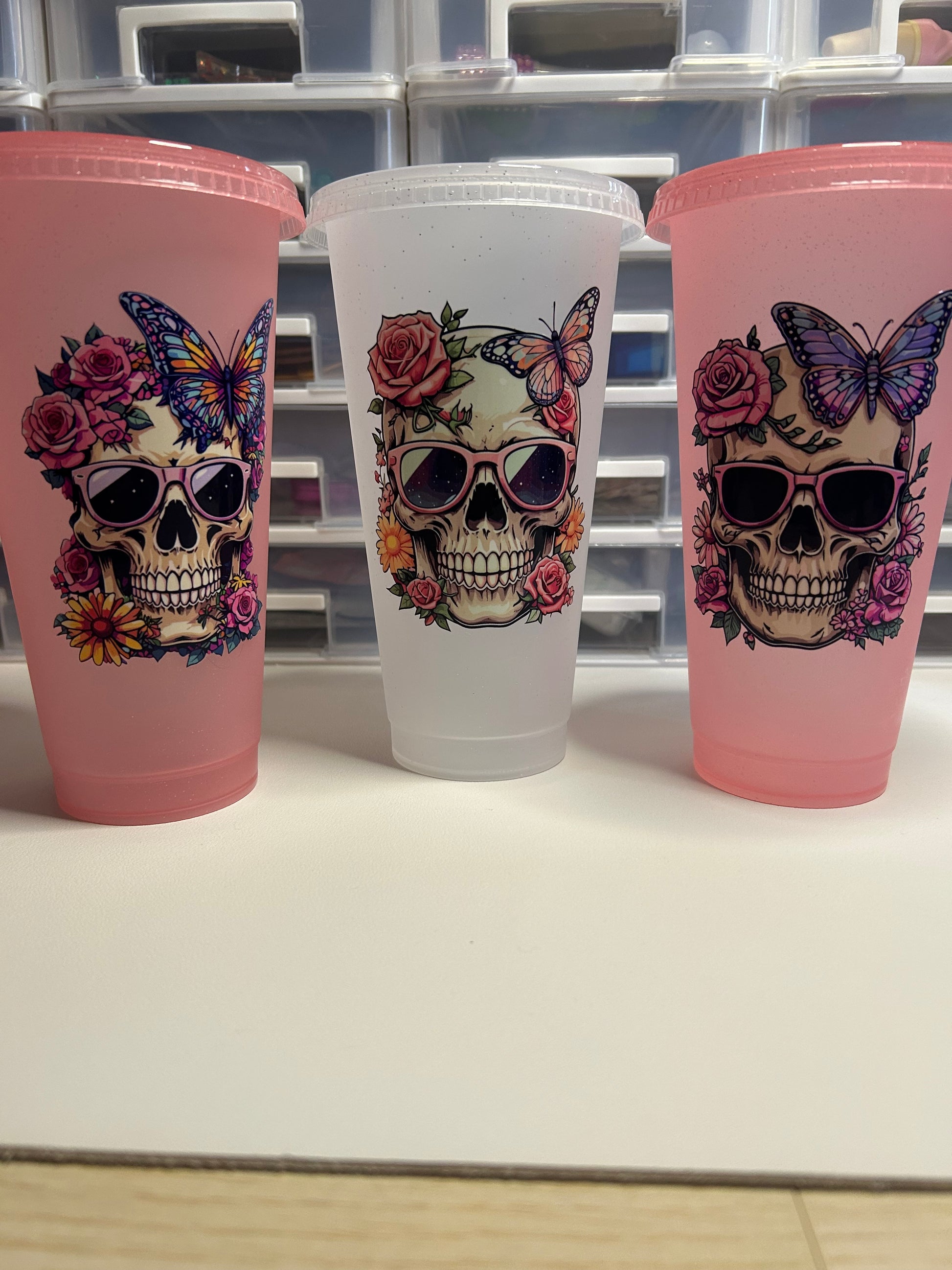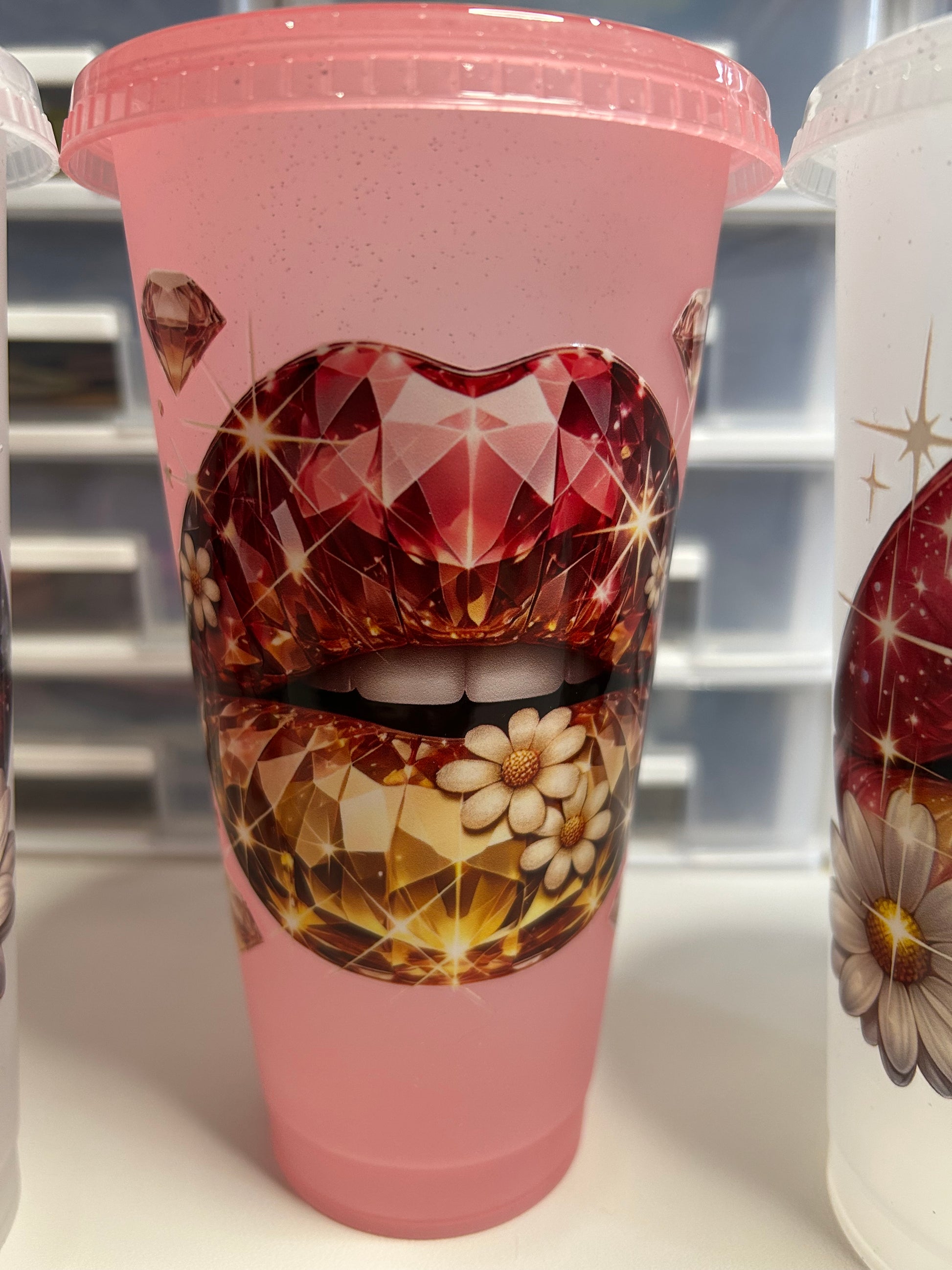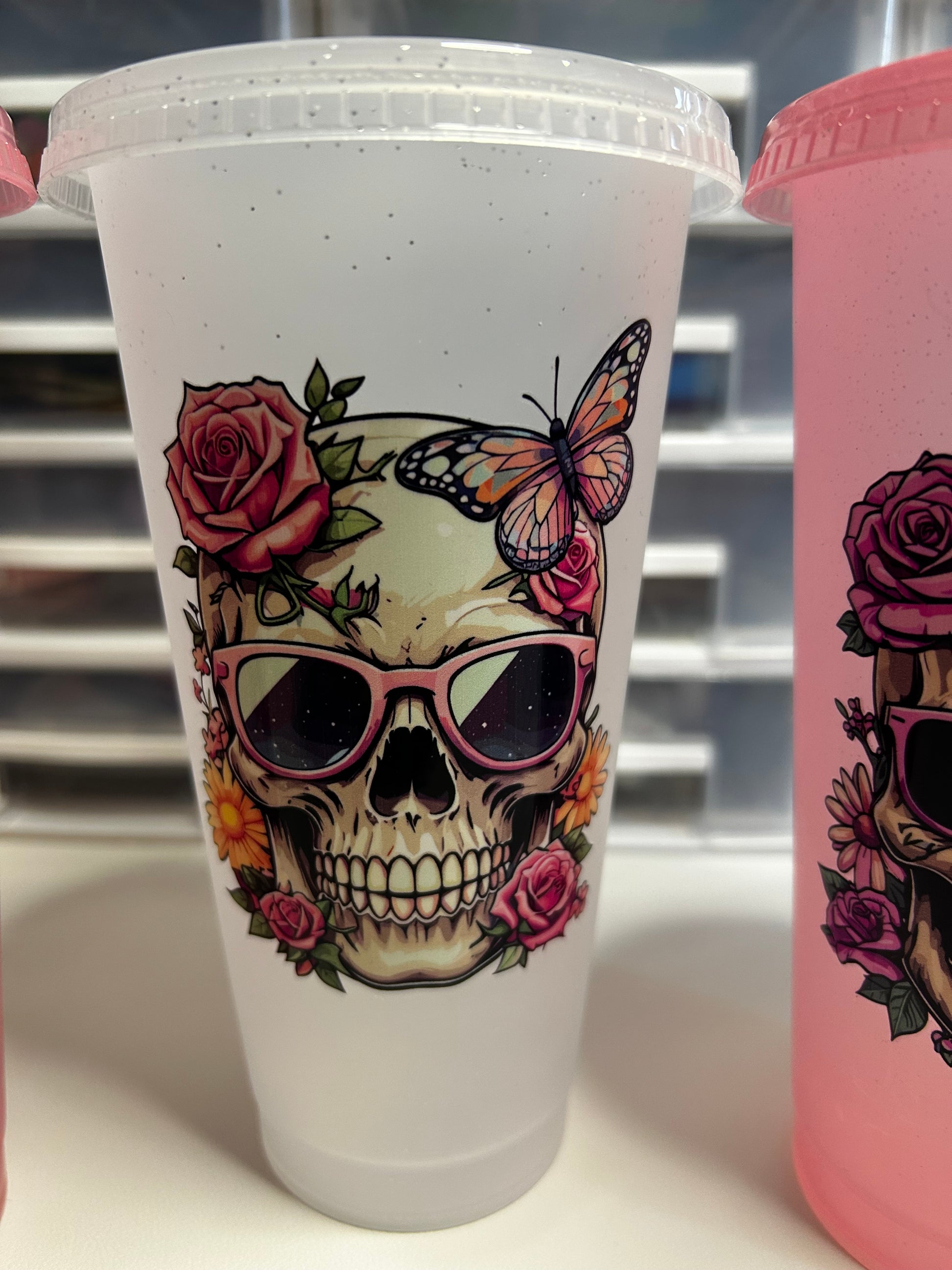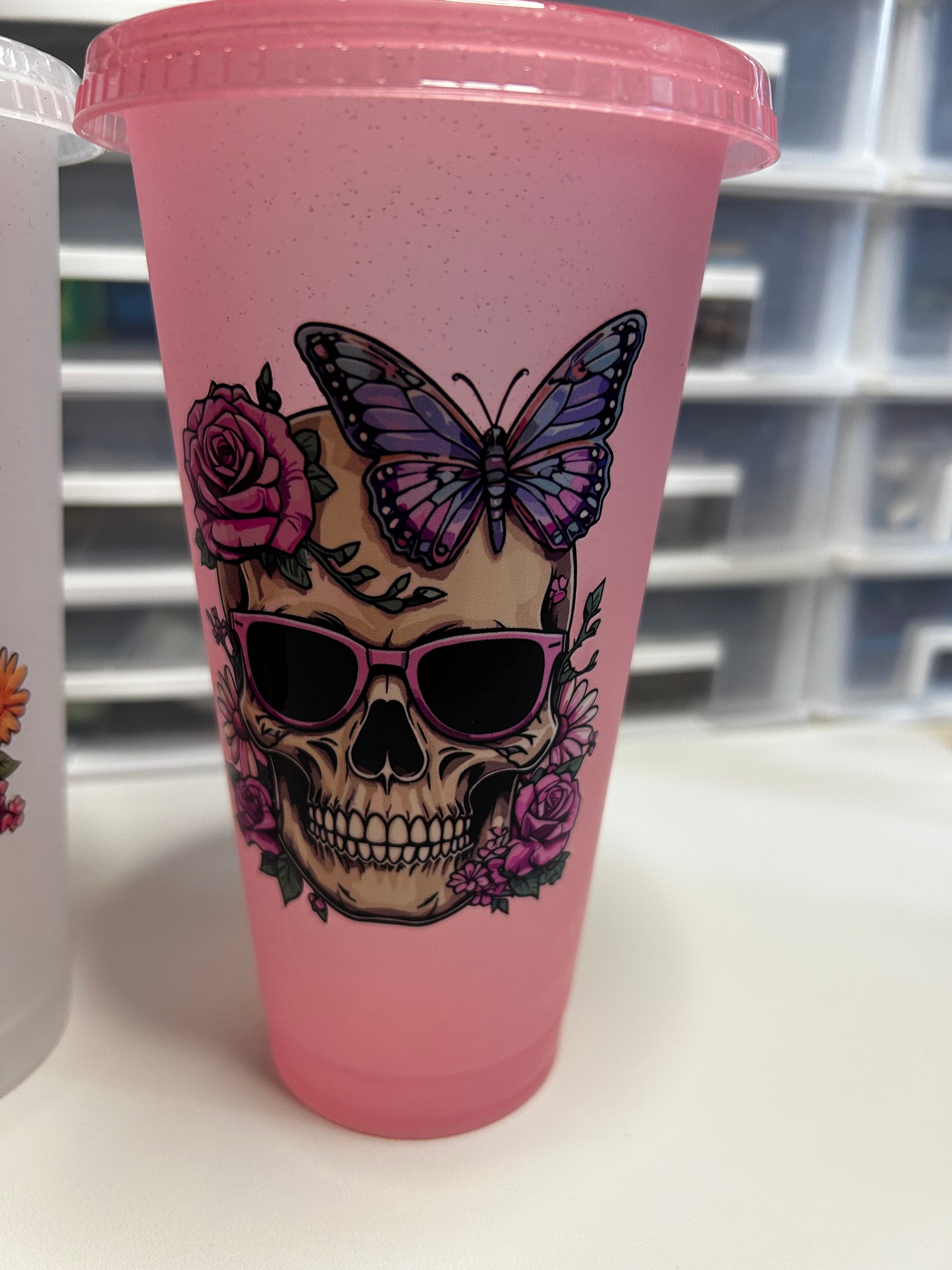 Handmade 24oz plastic glitter cold cups with various uv-dtf designs applied. Comes with matching colour straw.