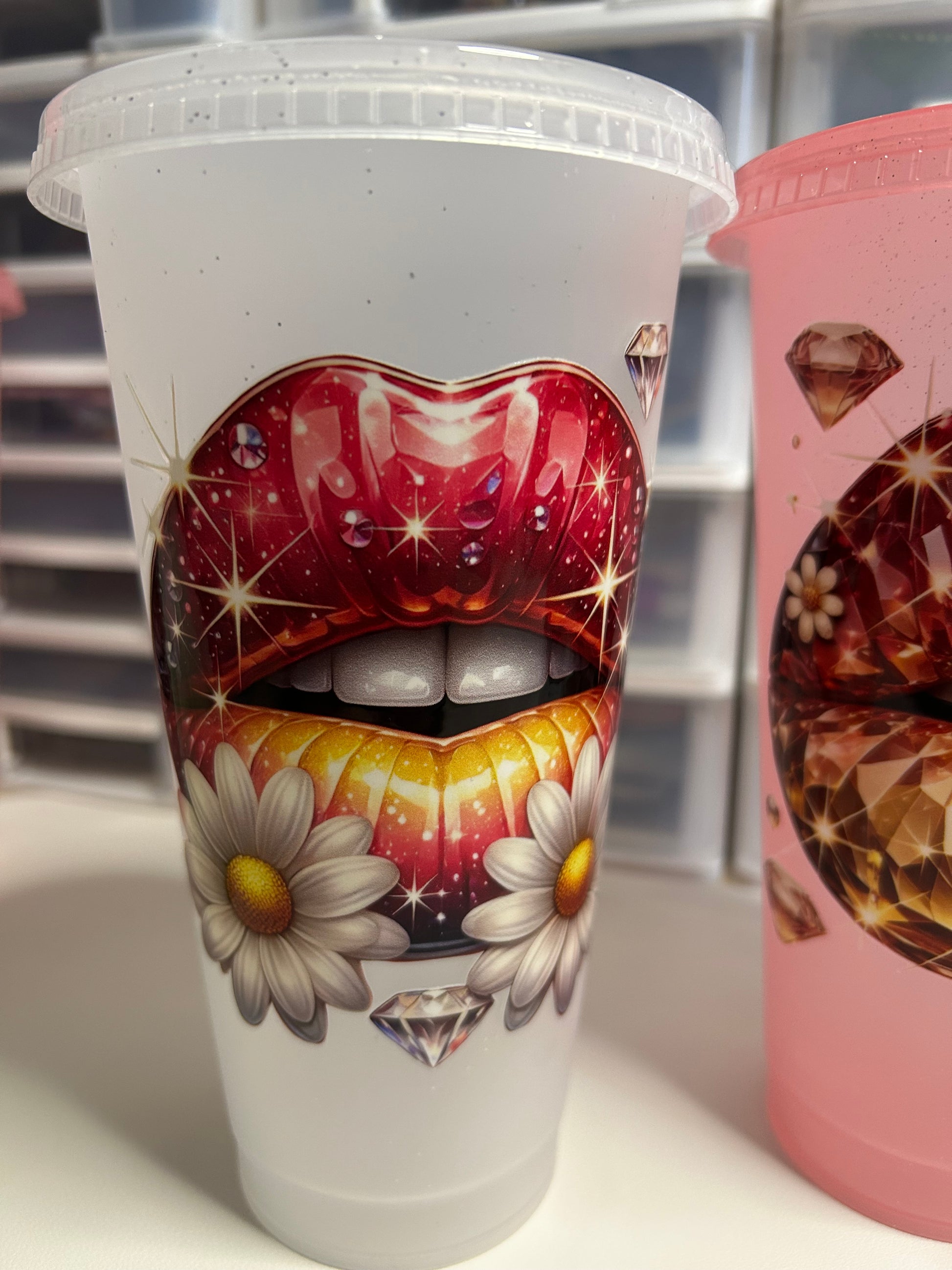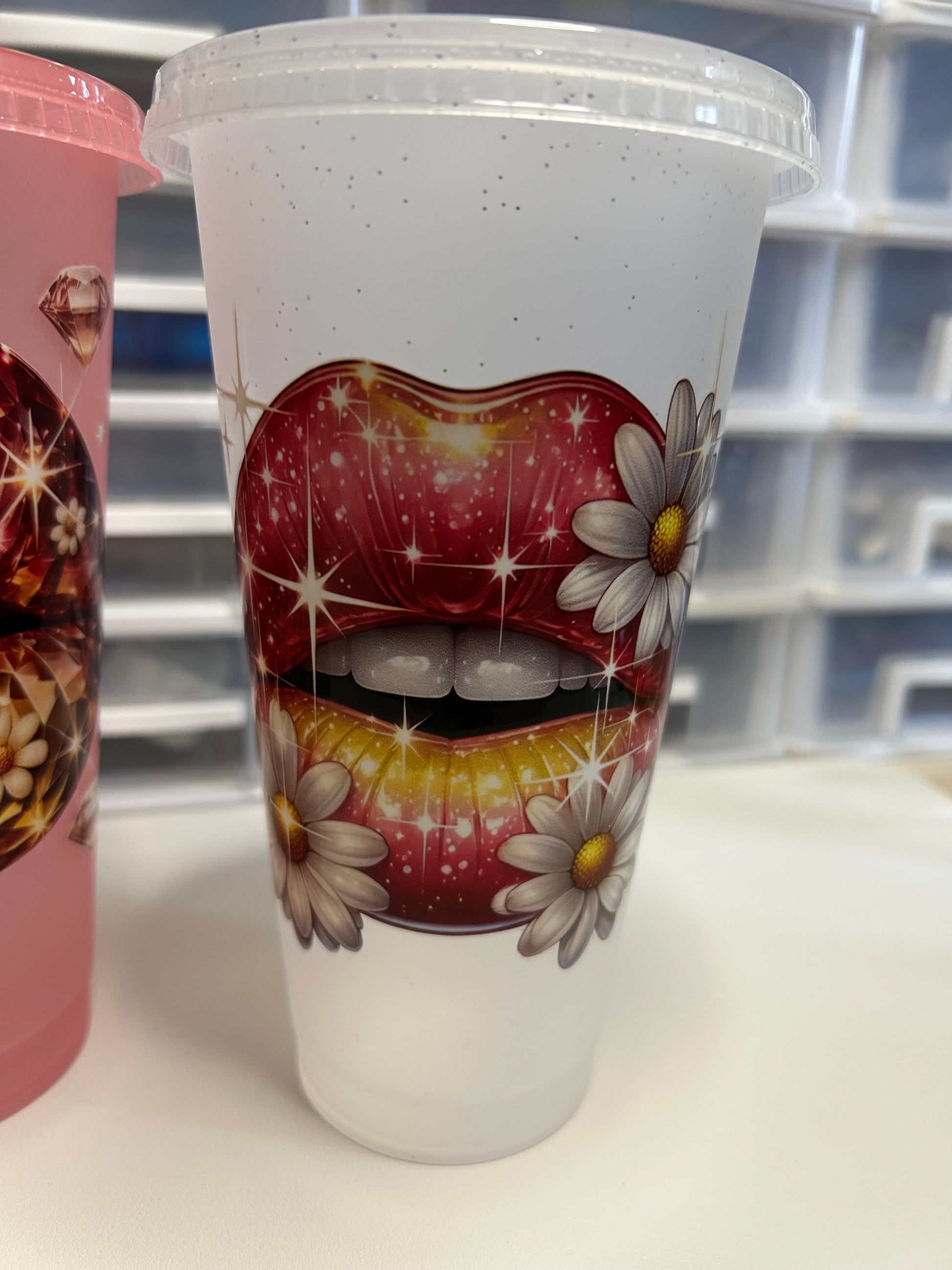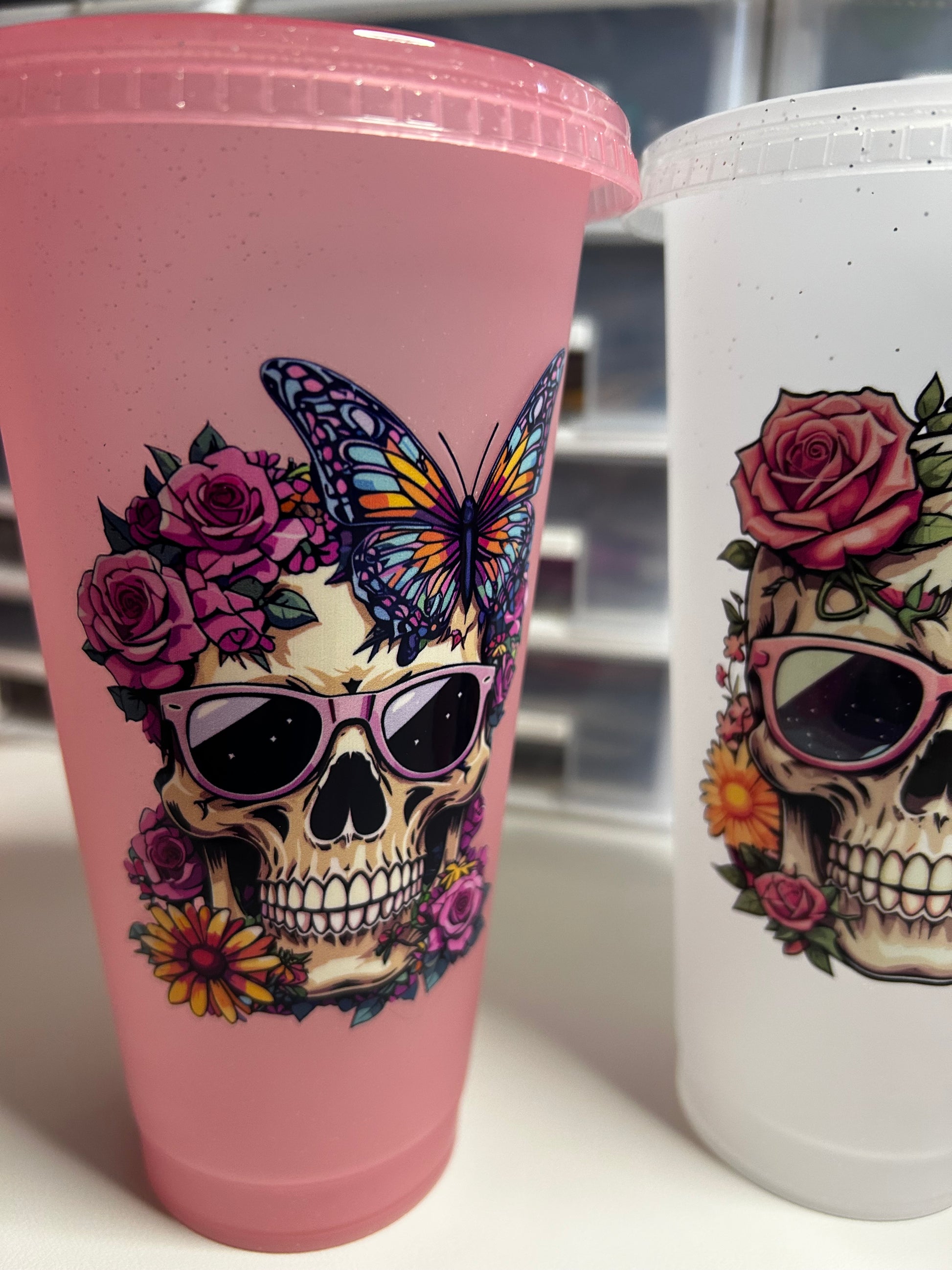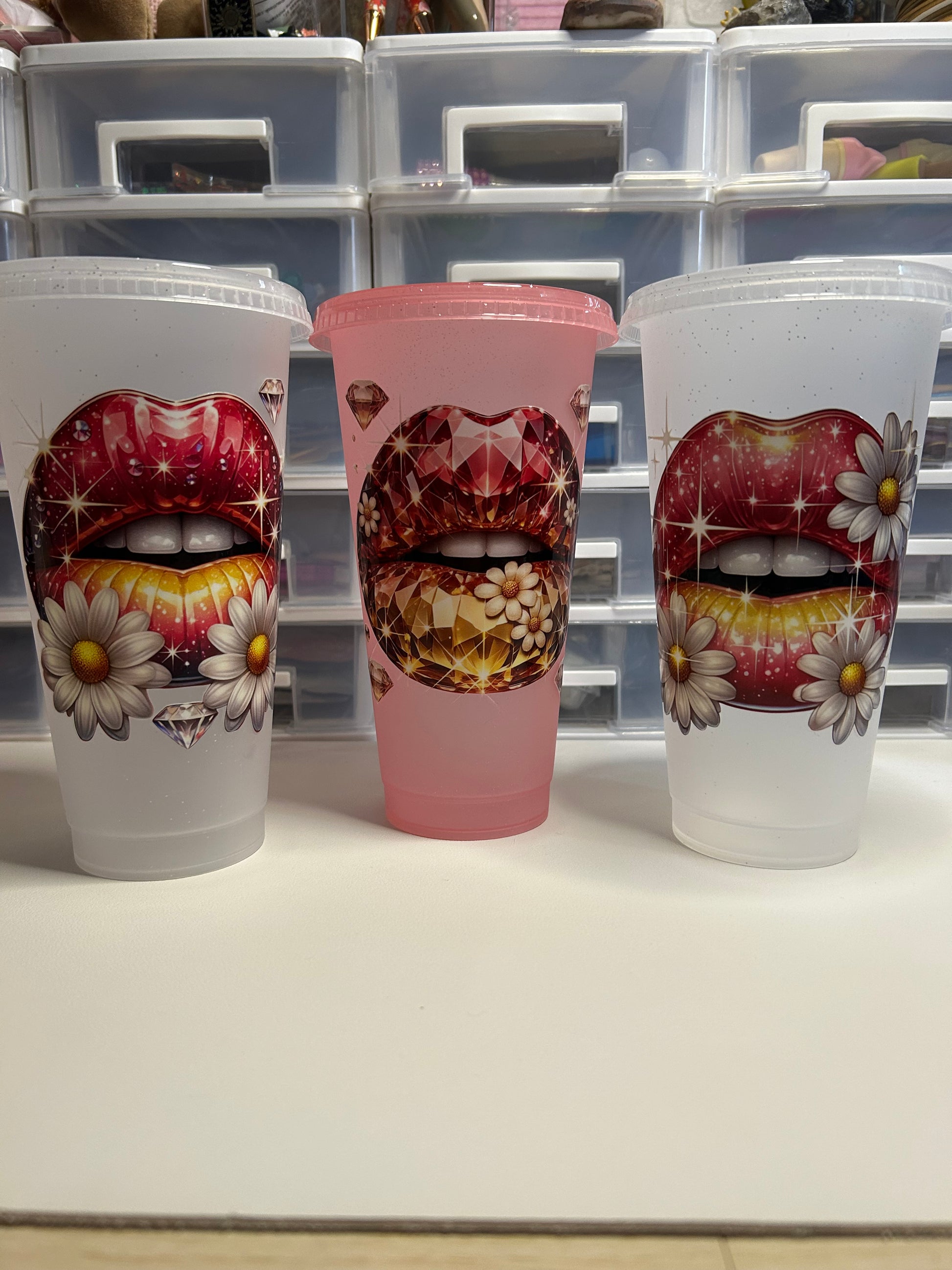 Handmade 24oz plastic glitter cold cups with various uv-dtf designs applied. Comes with matching colour straw.