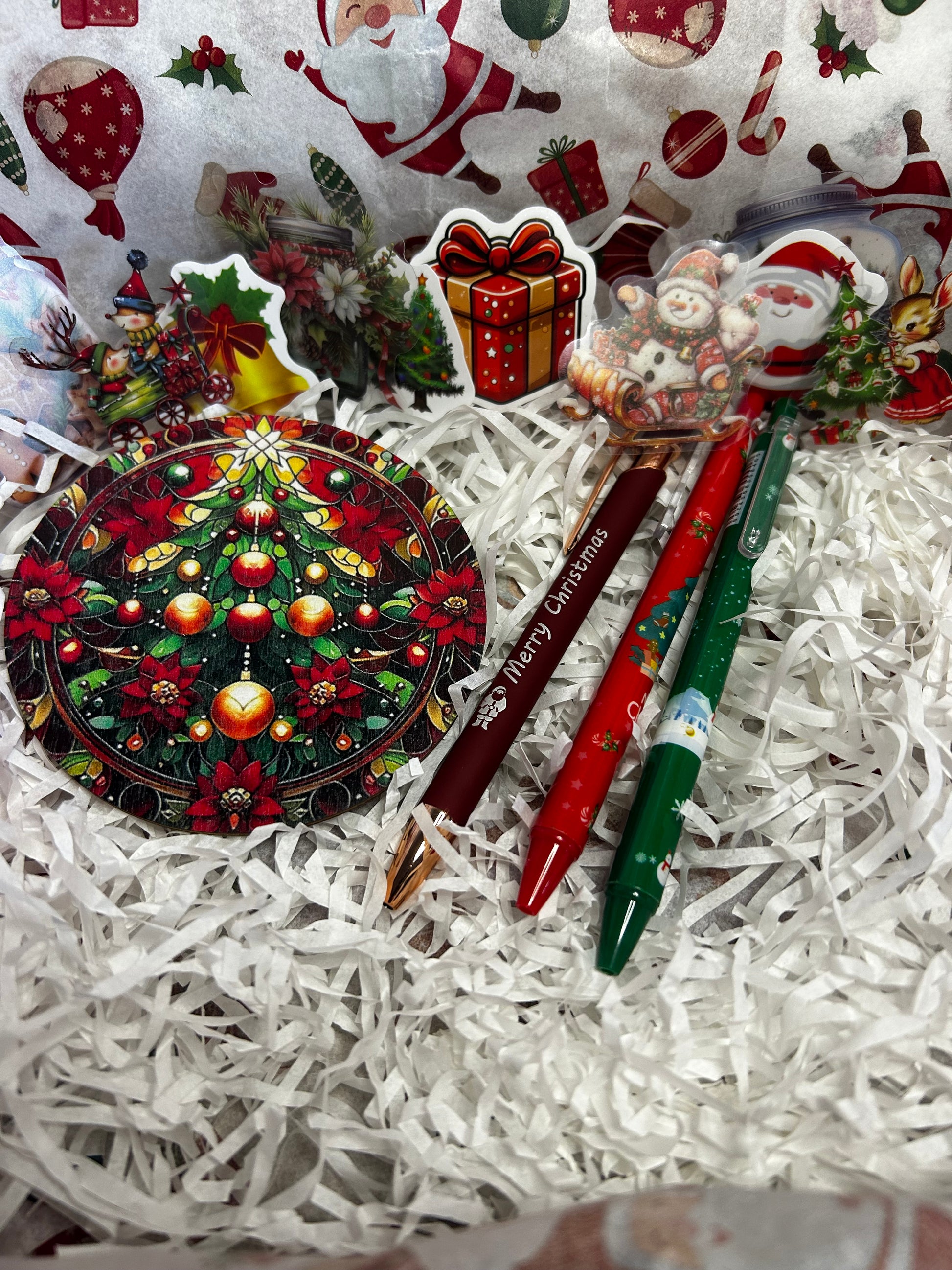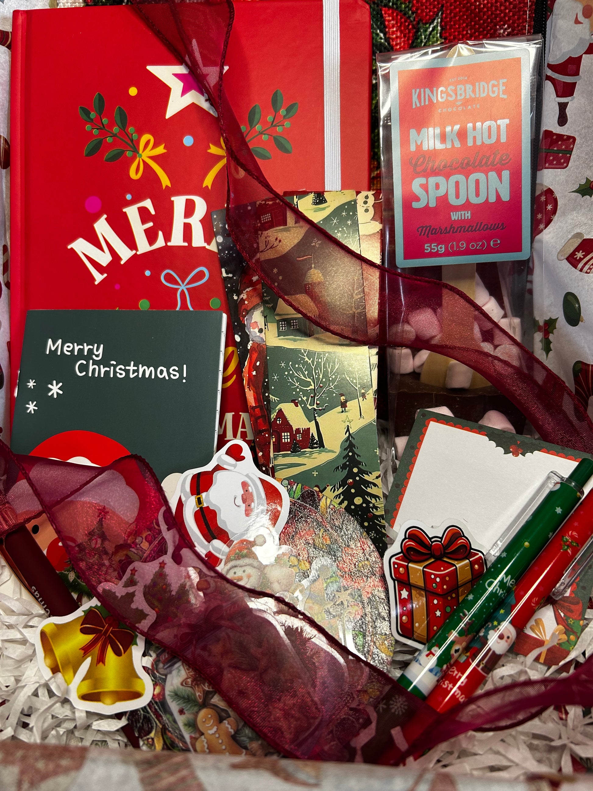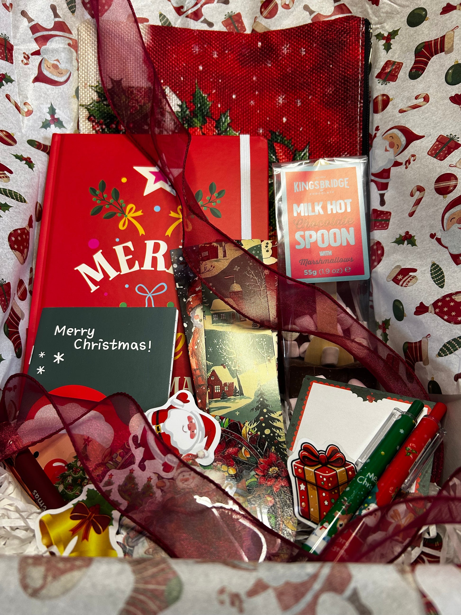 Also included is a large Christmas tree pouch that can be used to store stationery or make up. A deluxe red Christmas stylus pen, another 2 pens, sticky notes, magnetic bookmark (design may vary), mini notebook, coaster (design varies), 3 card bookmarks (design varies), stickers and a hot chocolate spoon to get you in the festive spirit. All packaged together in Christmas tissue paper and ribbon. Please note that the colour and design of the mini notebook can vary (green or yellow) and these are selected at random when packing your order.
