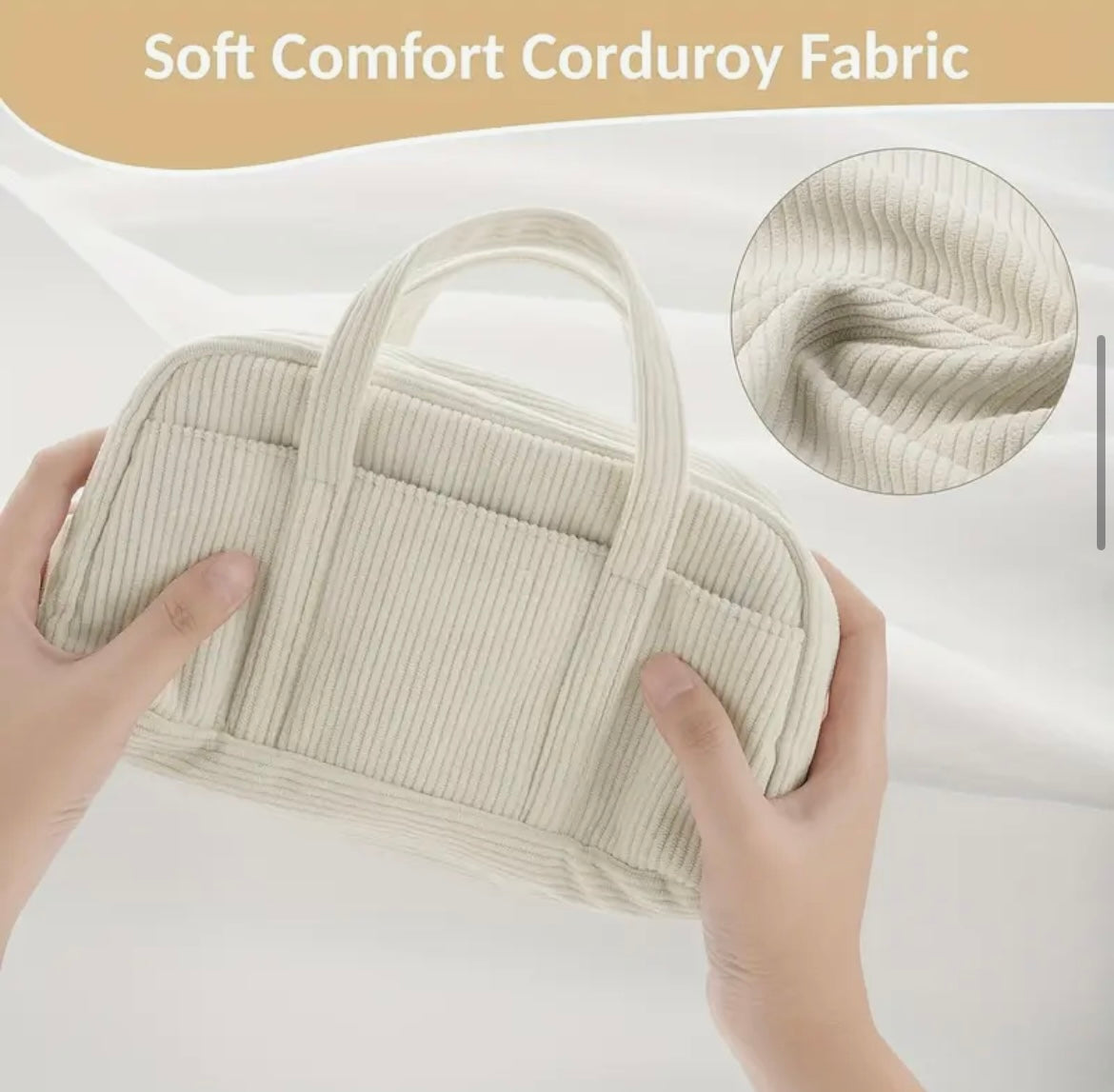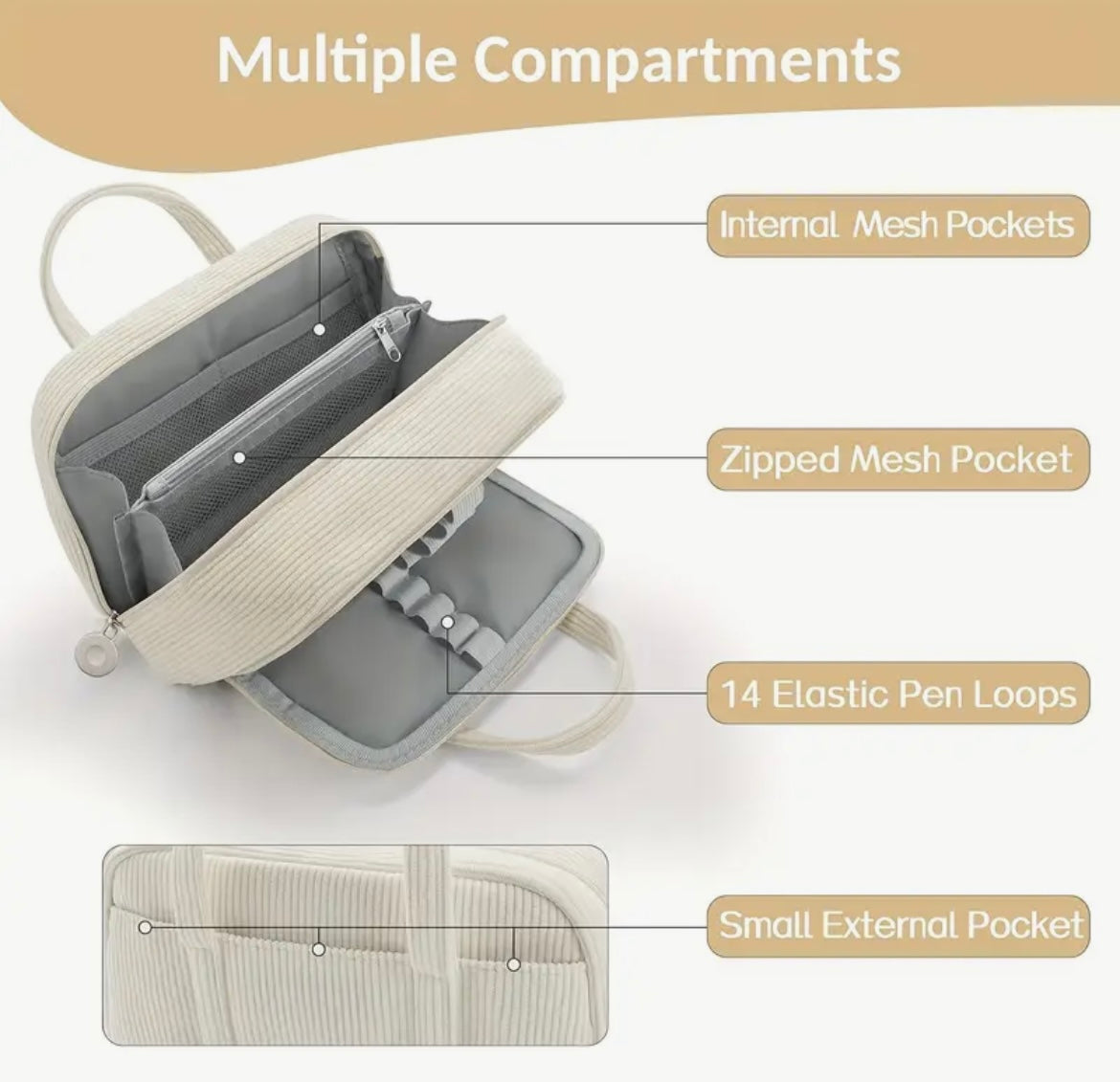 Deluxe Pencil Bag: The extra large corduroy pencil bag in cream is the perfect accessory for those who love stationery and is stylish and spacious enough to hold all of your writing essentials. With its classic cream colour and corduroy material it makes a timeless and practical addition to carry your essentials in style. Also includes a detachable bow keychain. Approx size: 22x13.5x7cm
