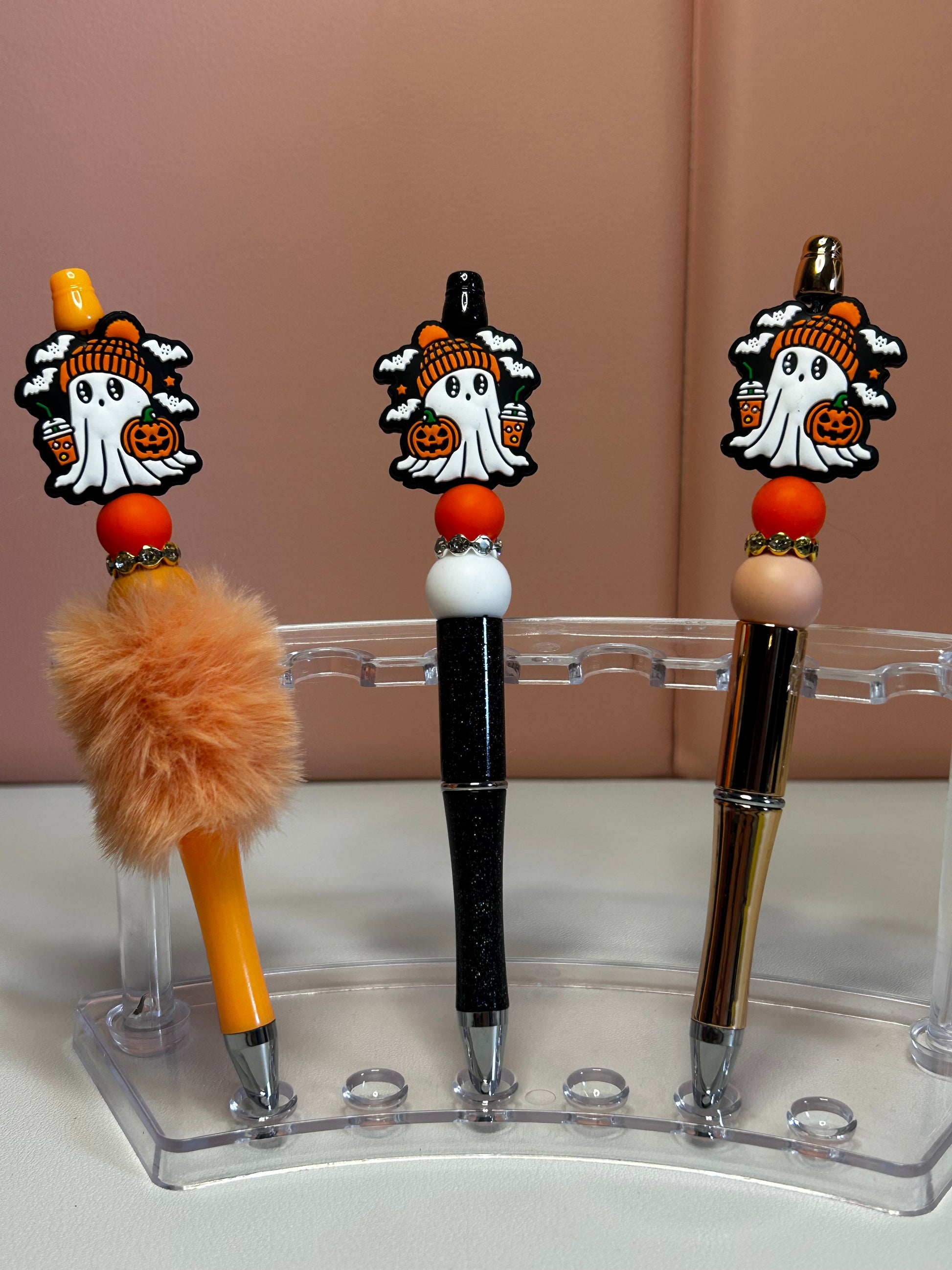 Handmade beaded pens with ghost & pumpkin silicone focal bead. Black ink.