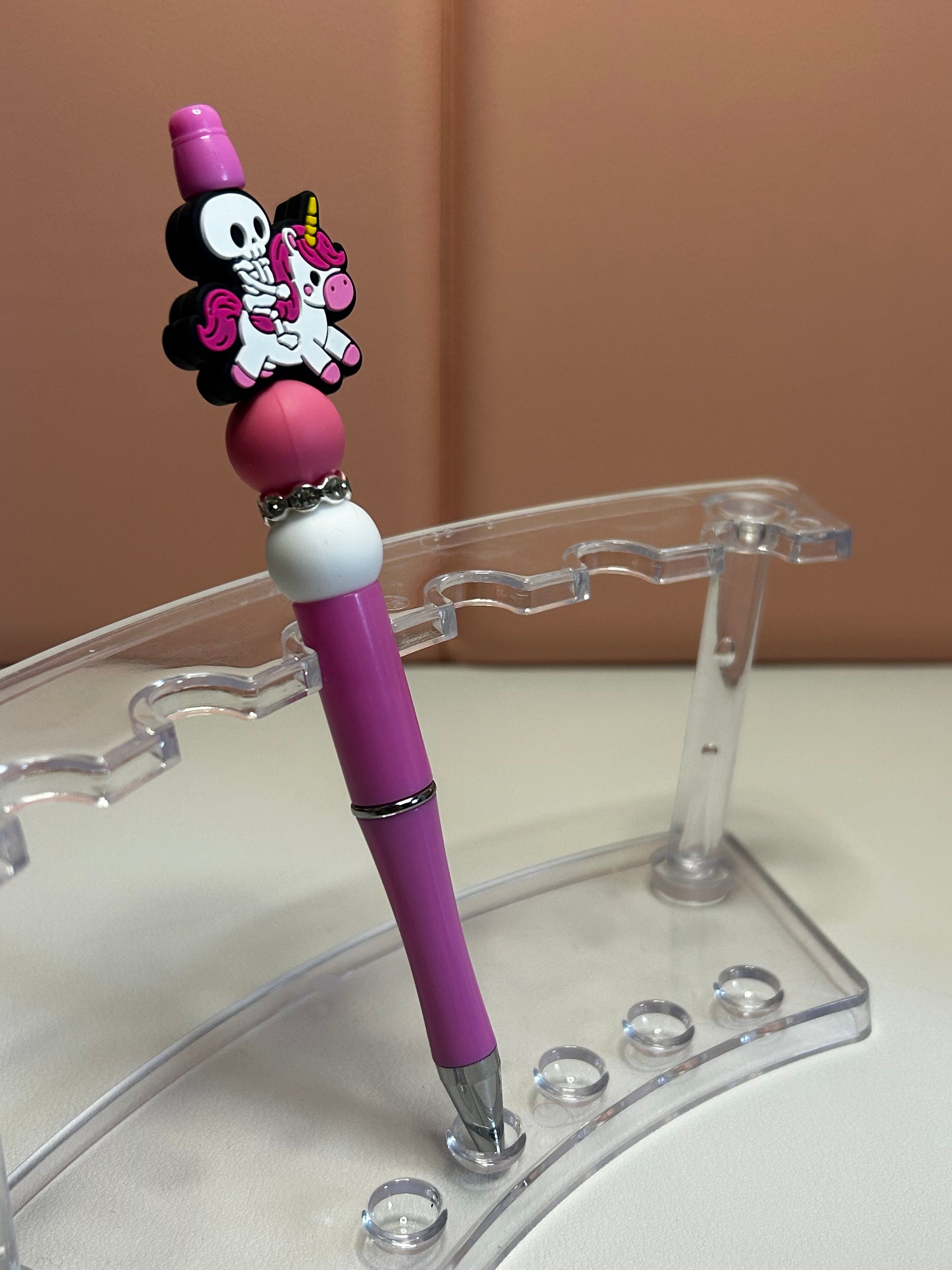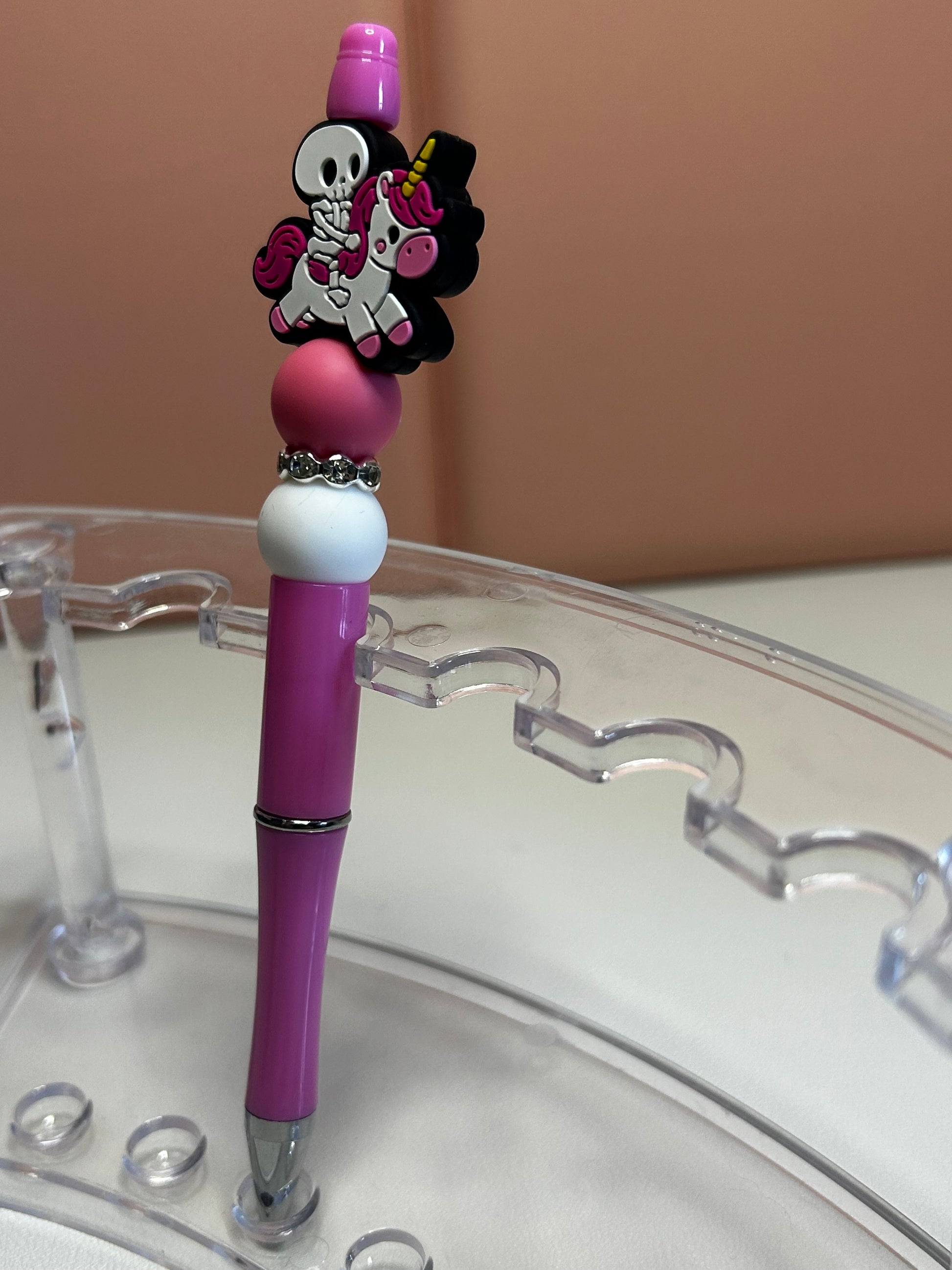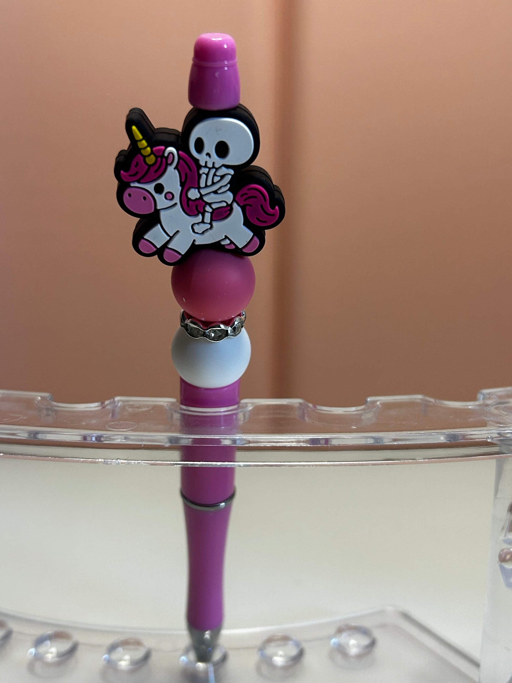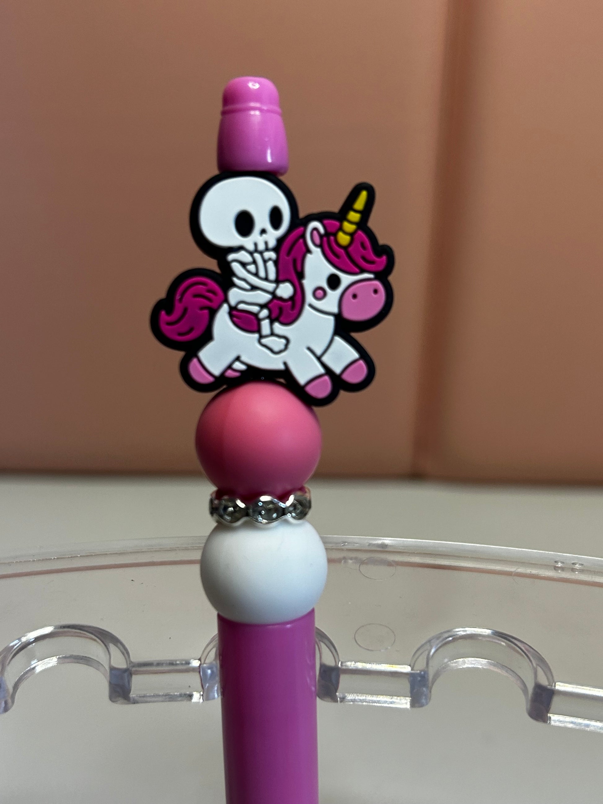 Handmade beaded pens with skeleton & unicorn silicone focal bead. Black ink.