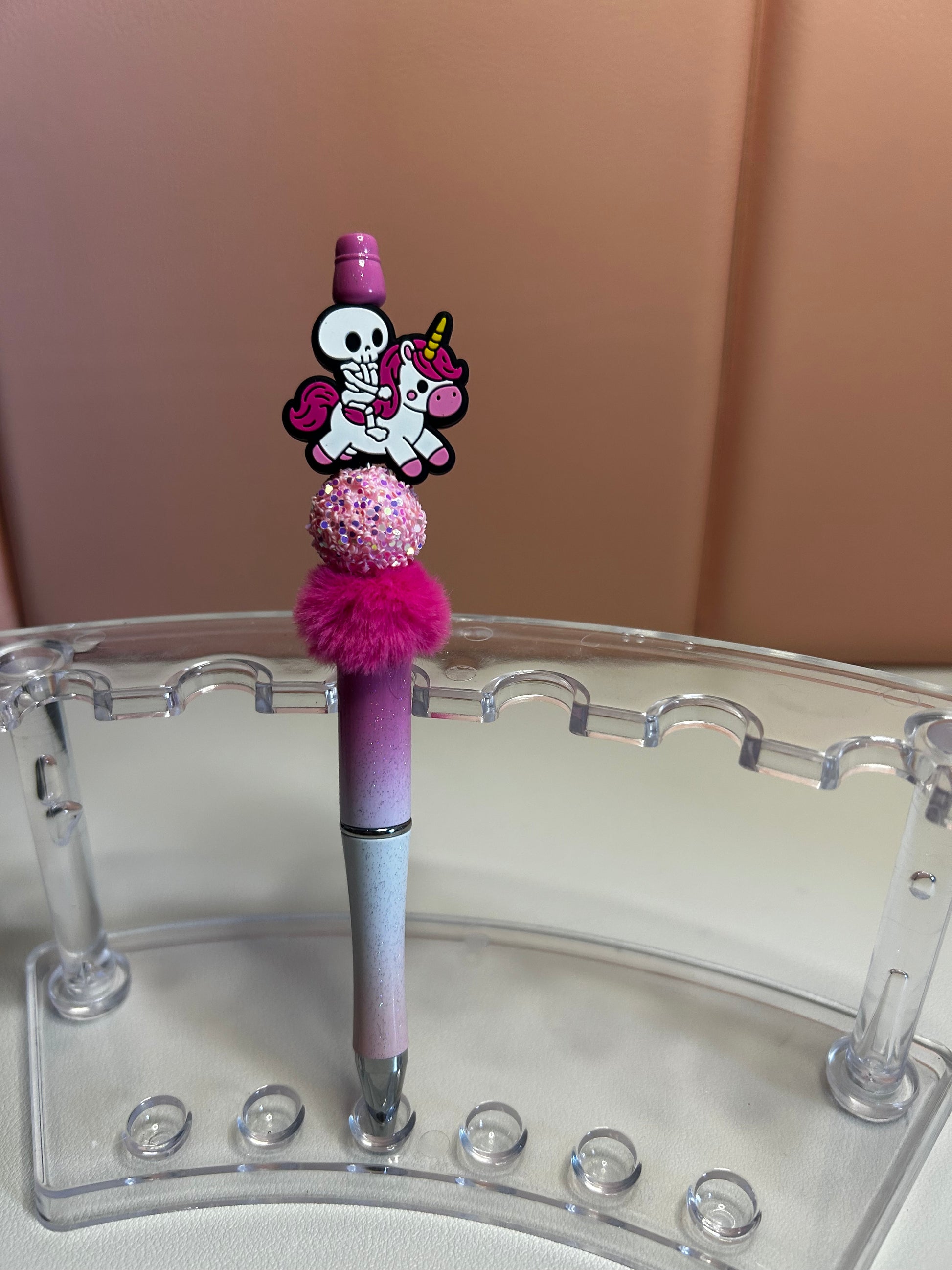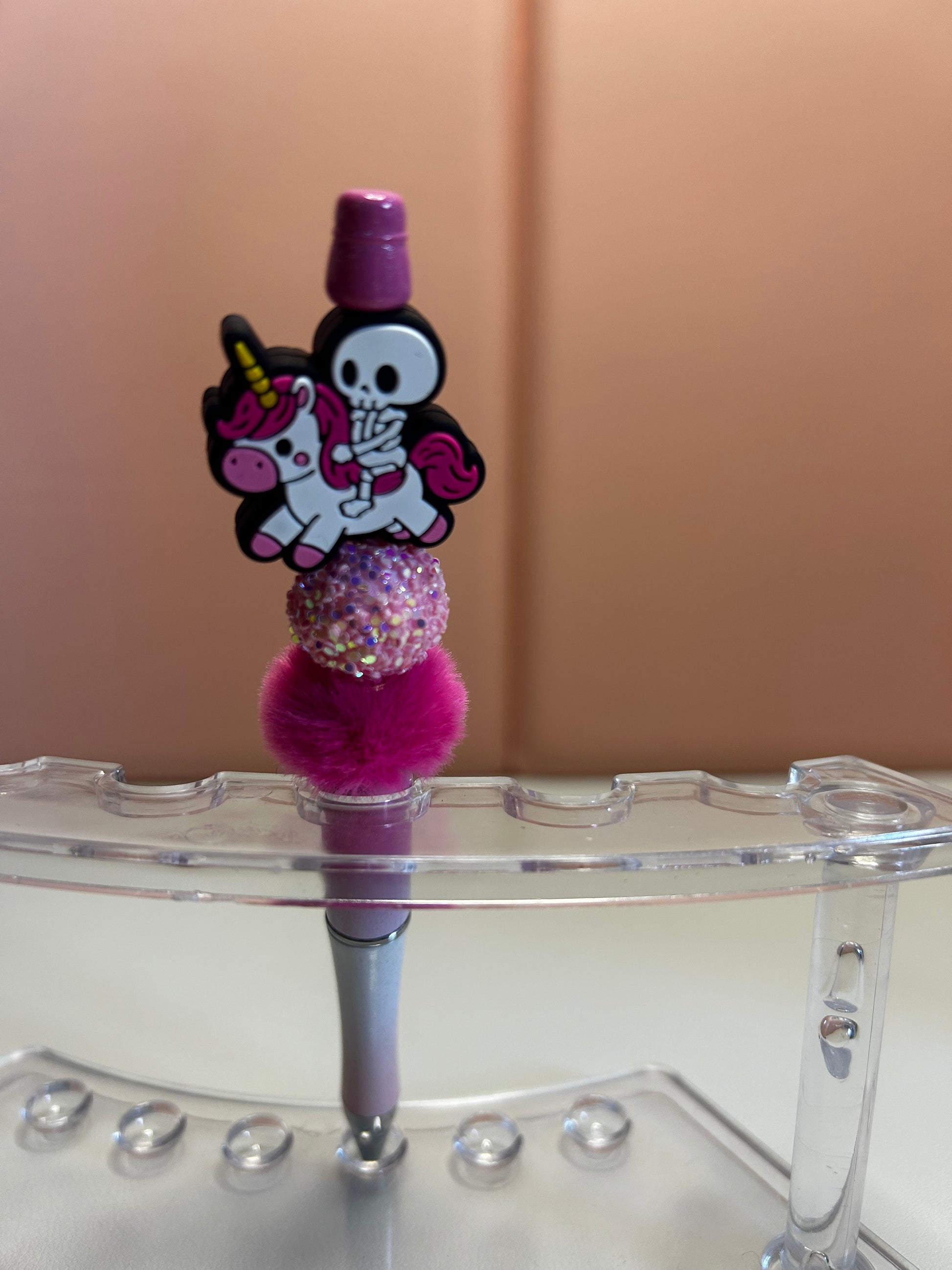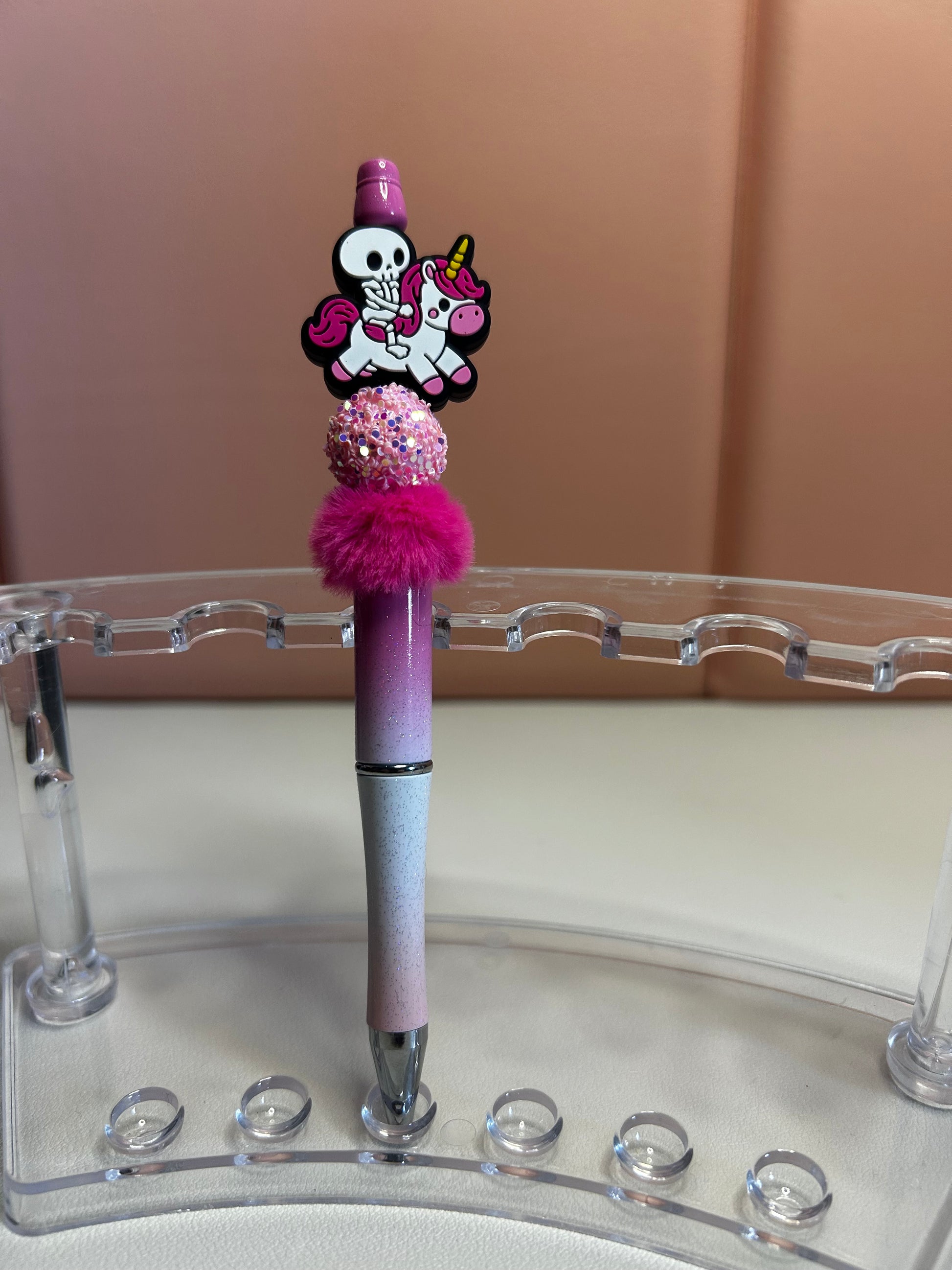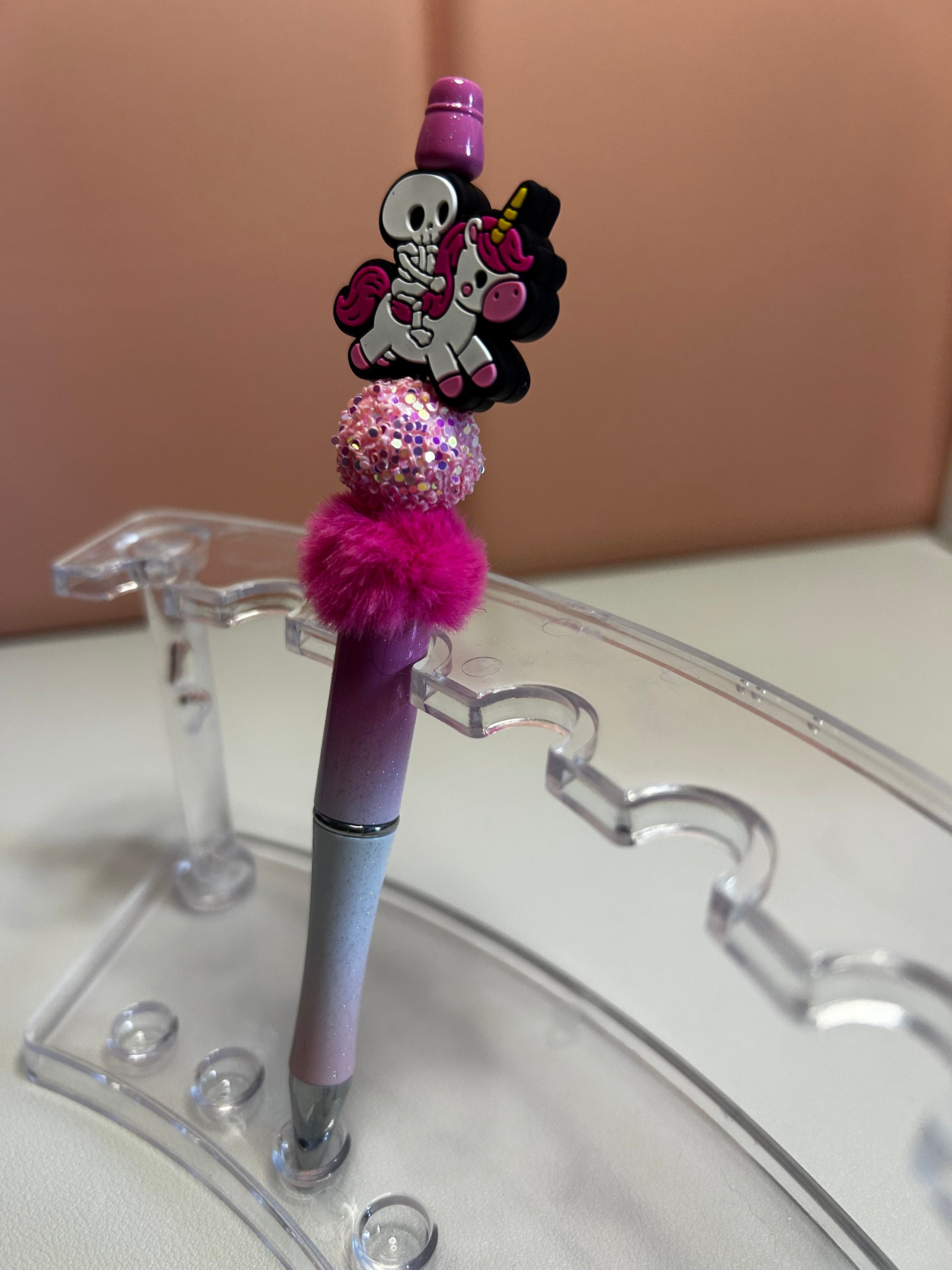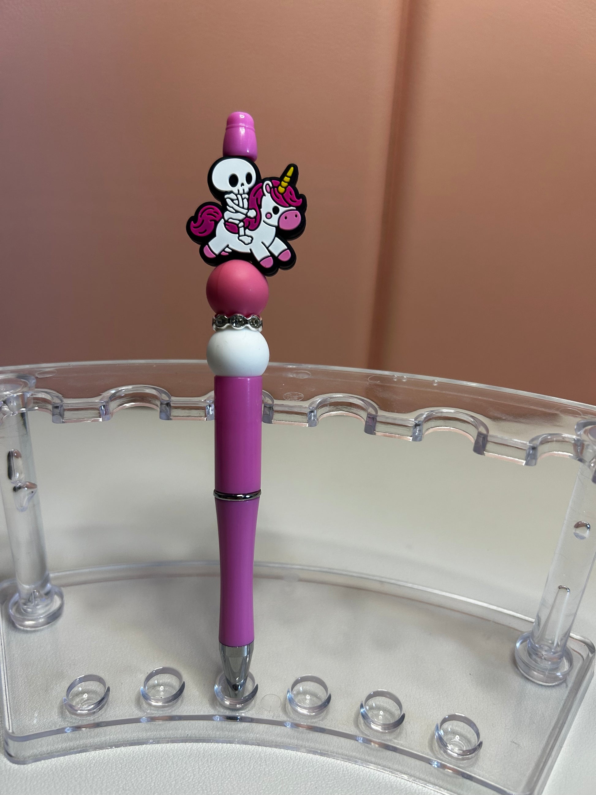 Handmade beaded pens with skeleton & unicorn silicone focal bead. Black ink.
