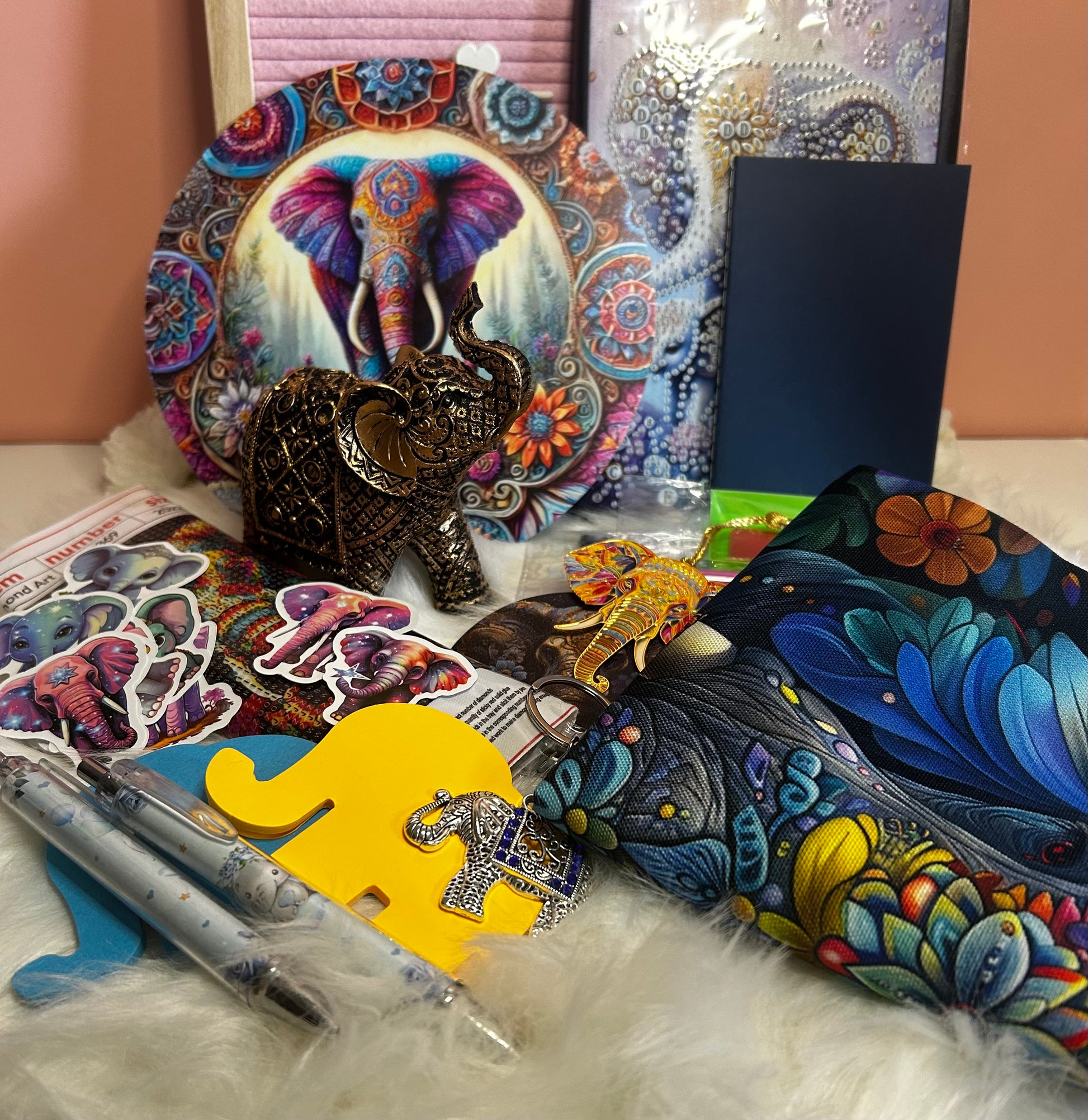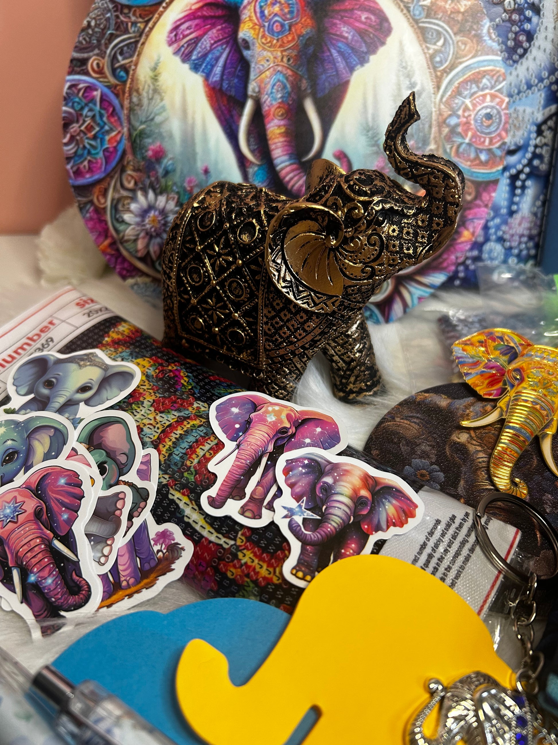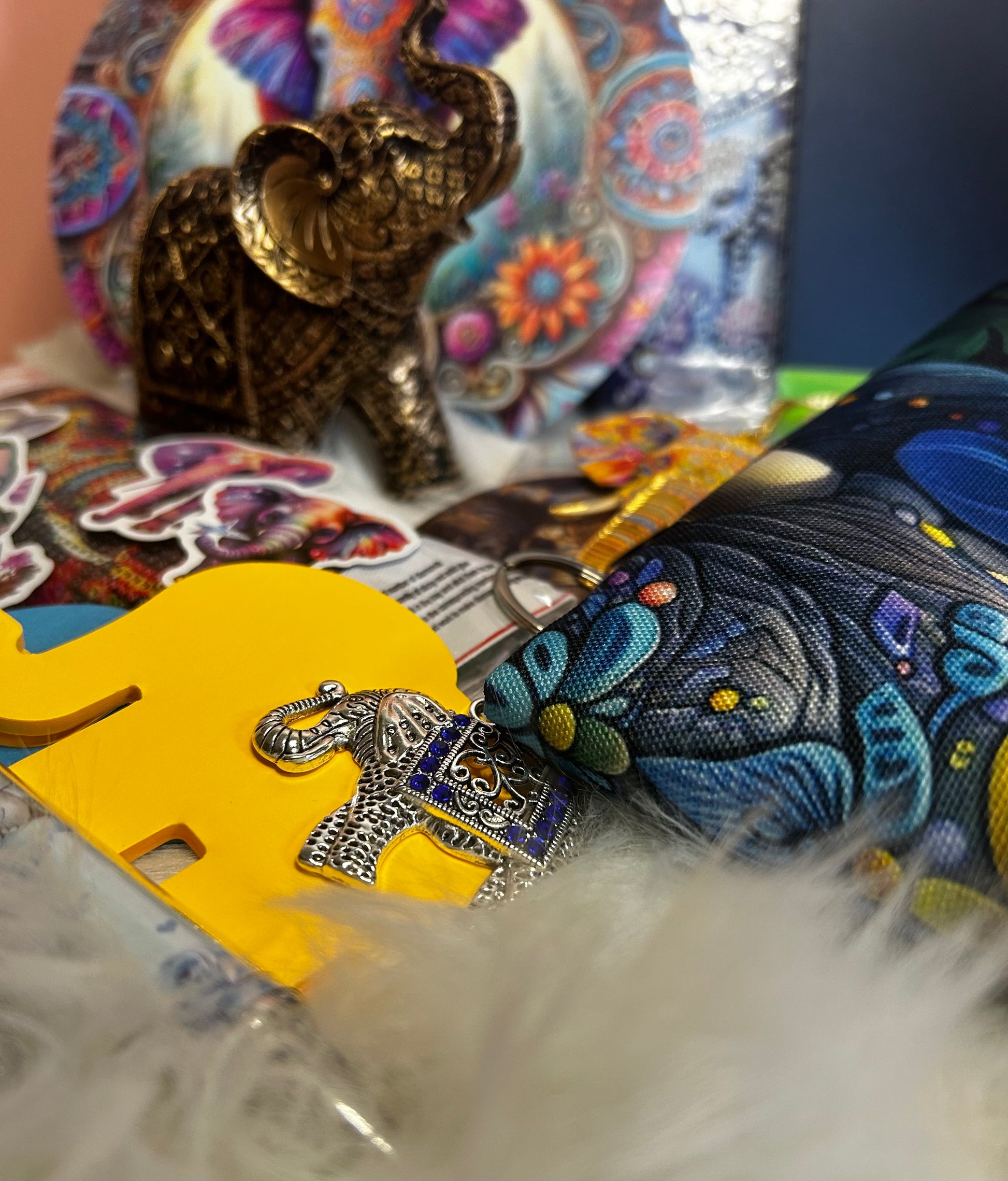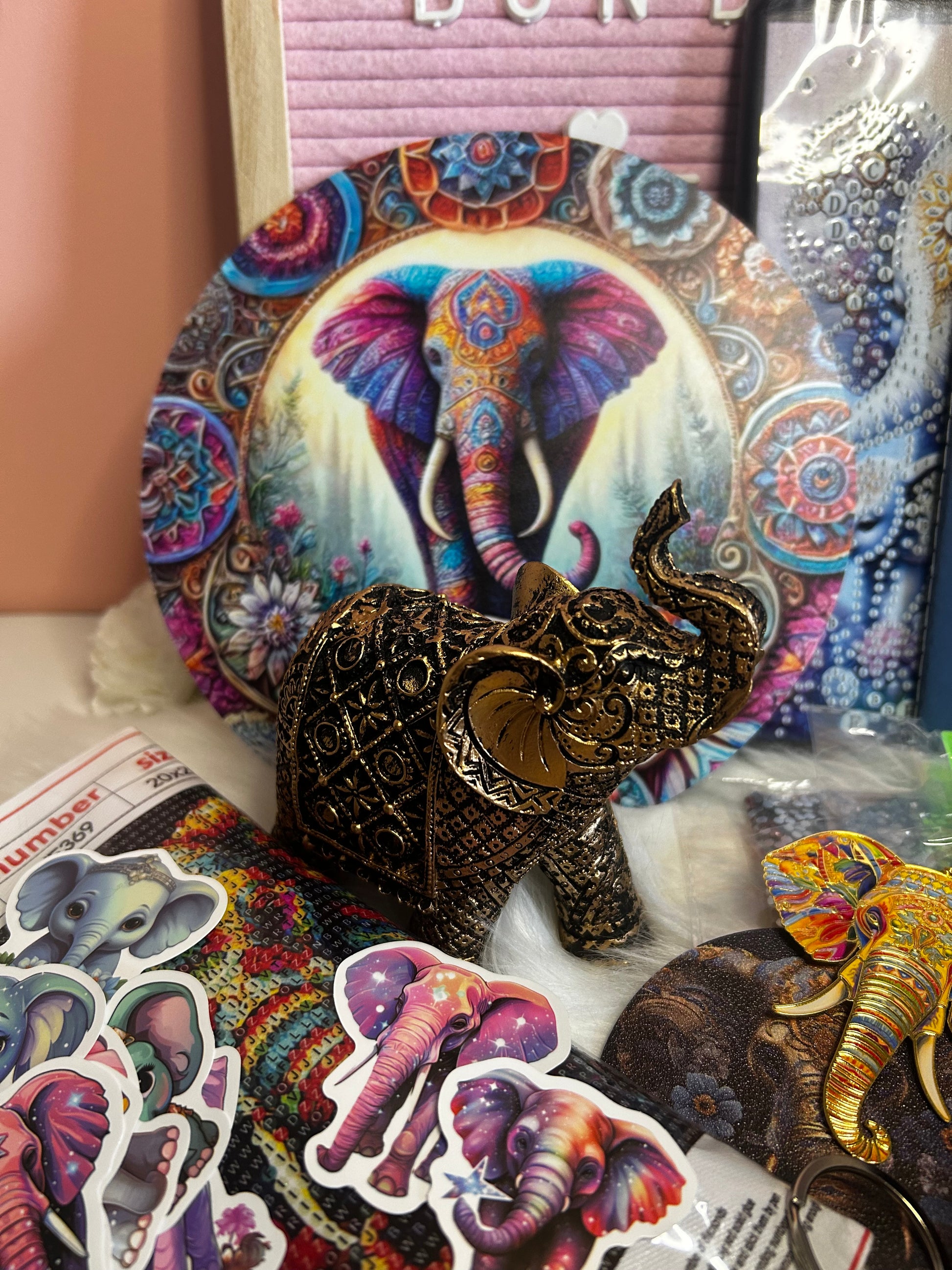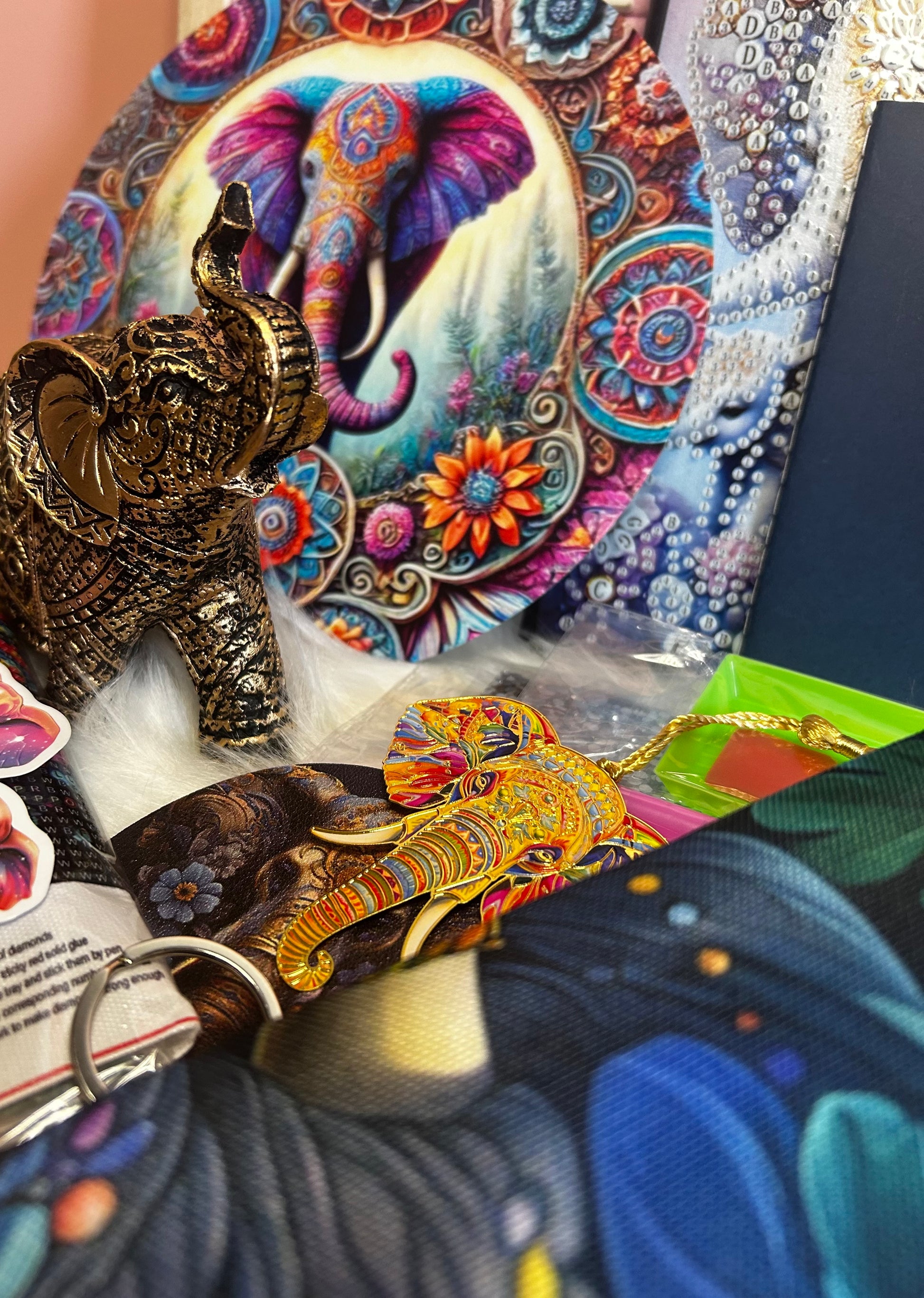 A mandala elephant themed bookish bundle in a blue multi-colour aesthetic. In your bundle you will receive a 20cm metal round decor, diamond painting notebook, 20cm diamond painting kit, pouch, mini drawstring bag, resin gold elephant figurine, tote bag, mini notebook, metal bookmark with tassel, 2 x sticky notes, 2 x pens, keyring, coaster & stickers.
