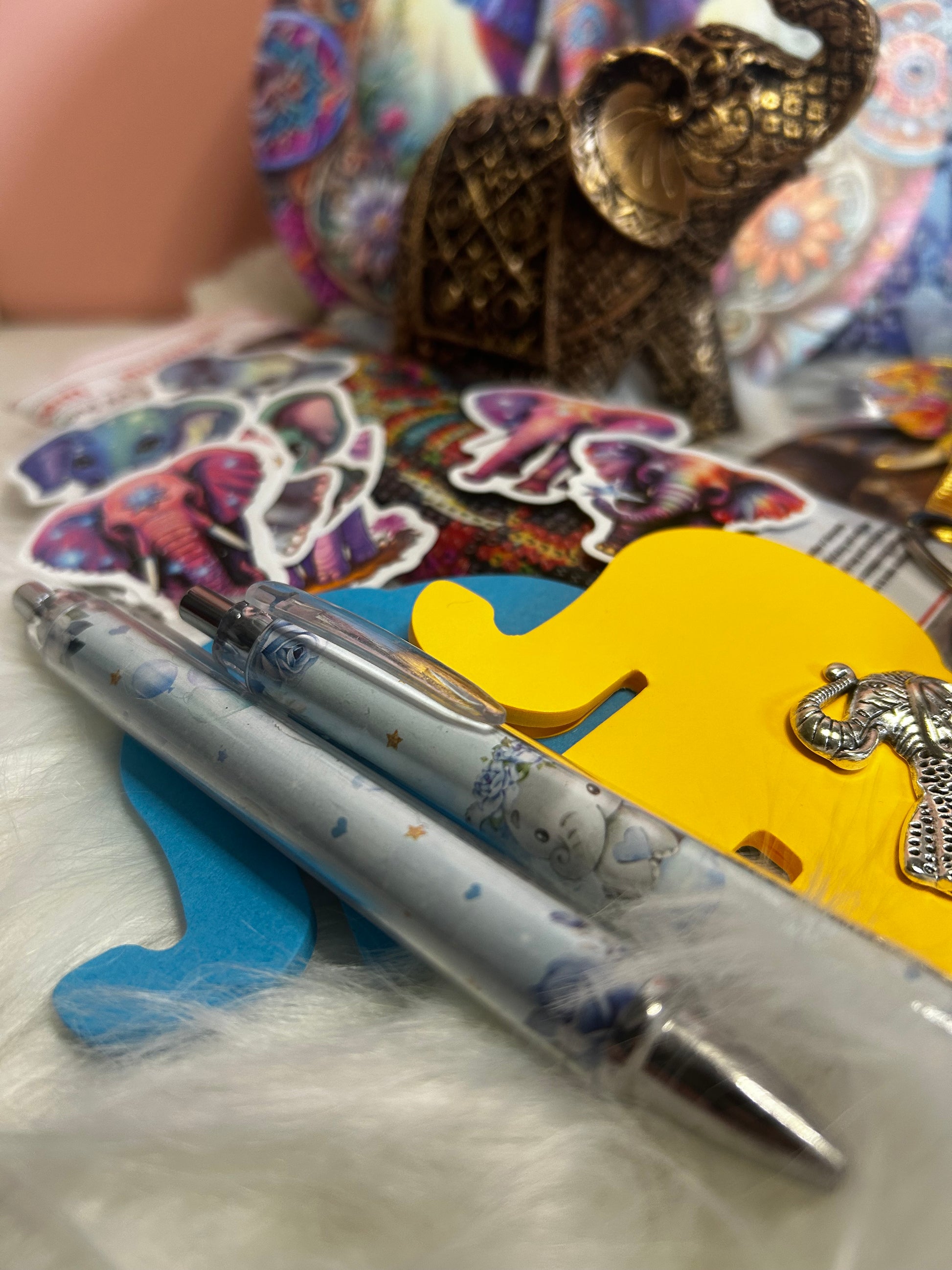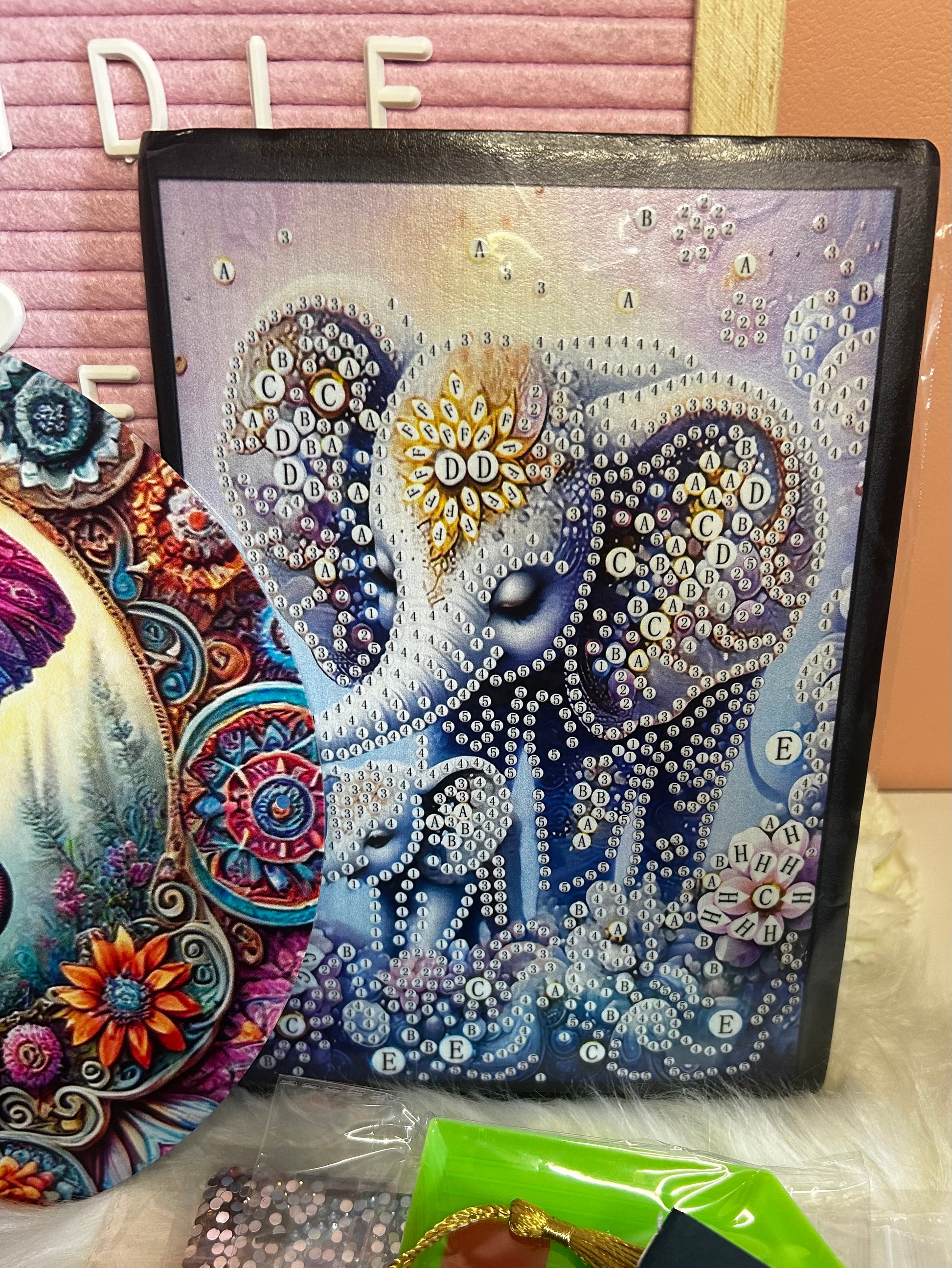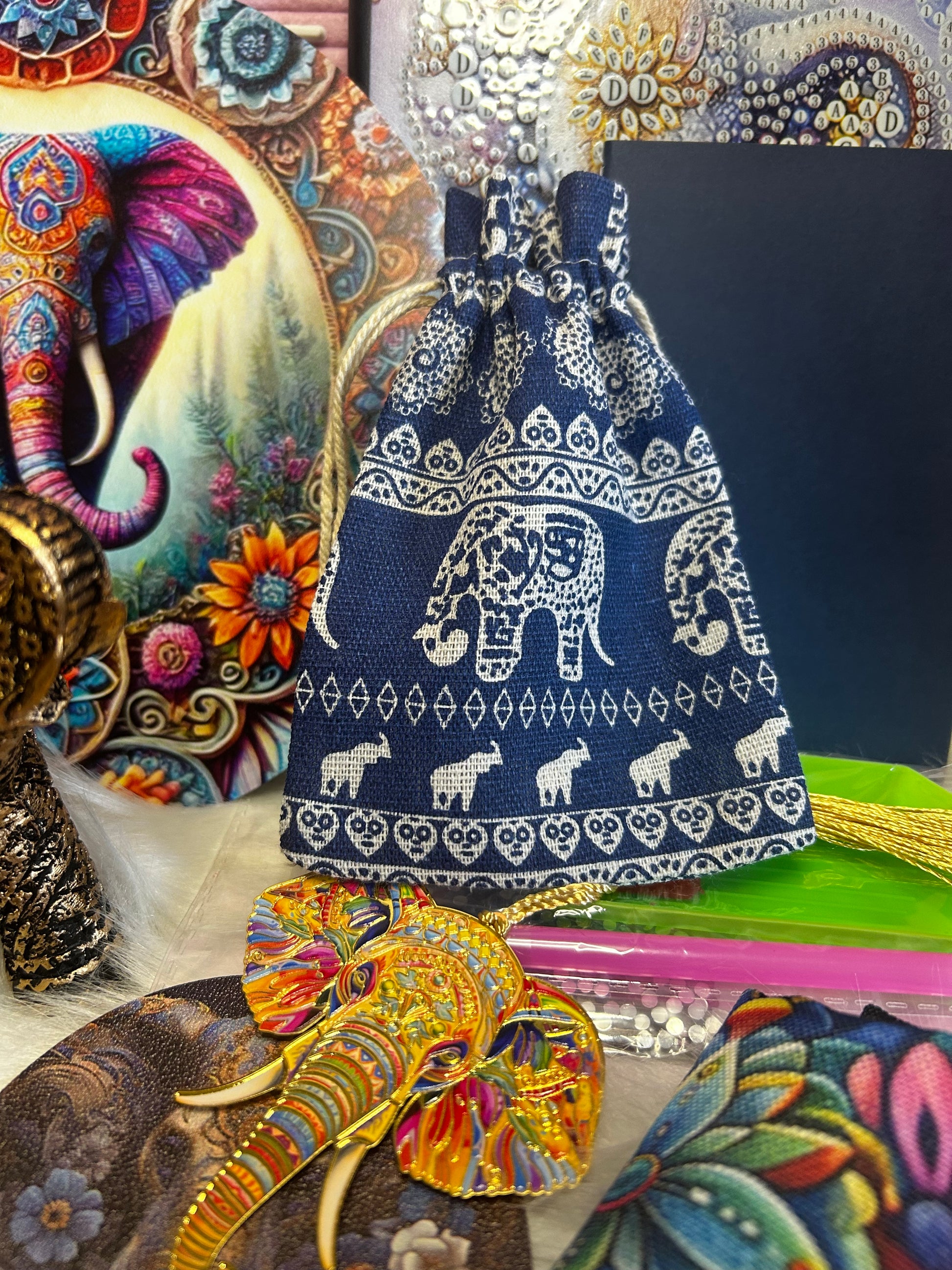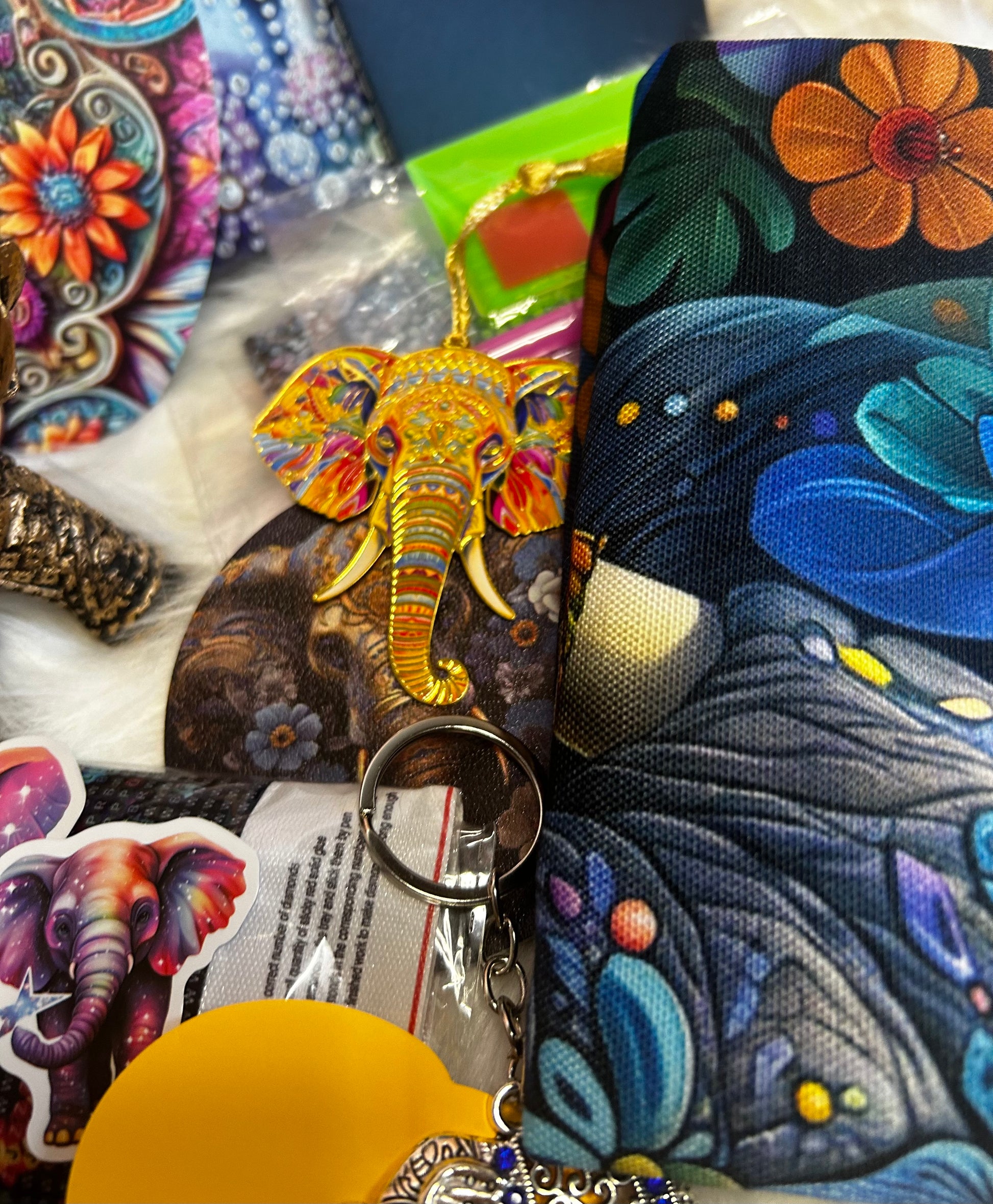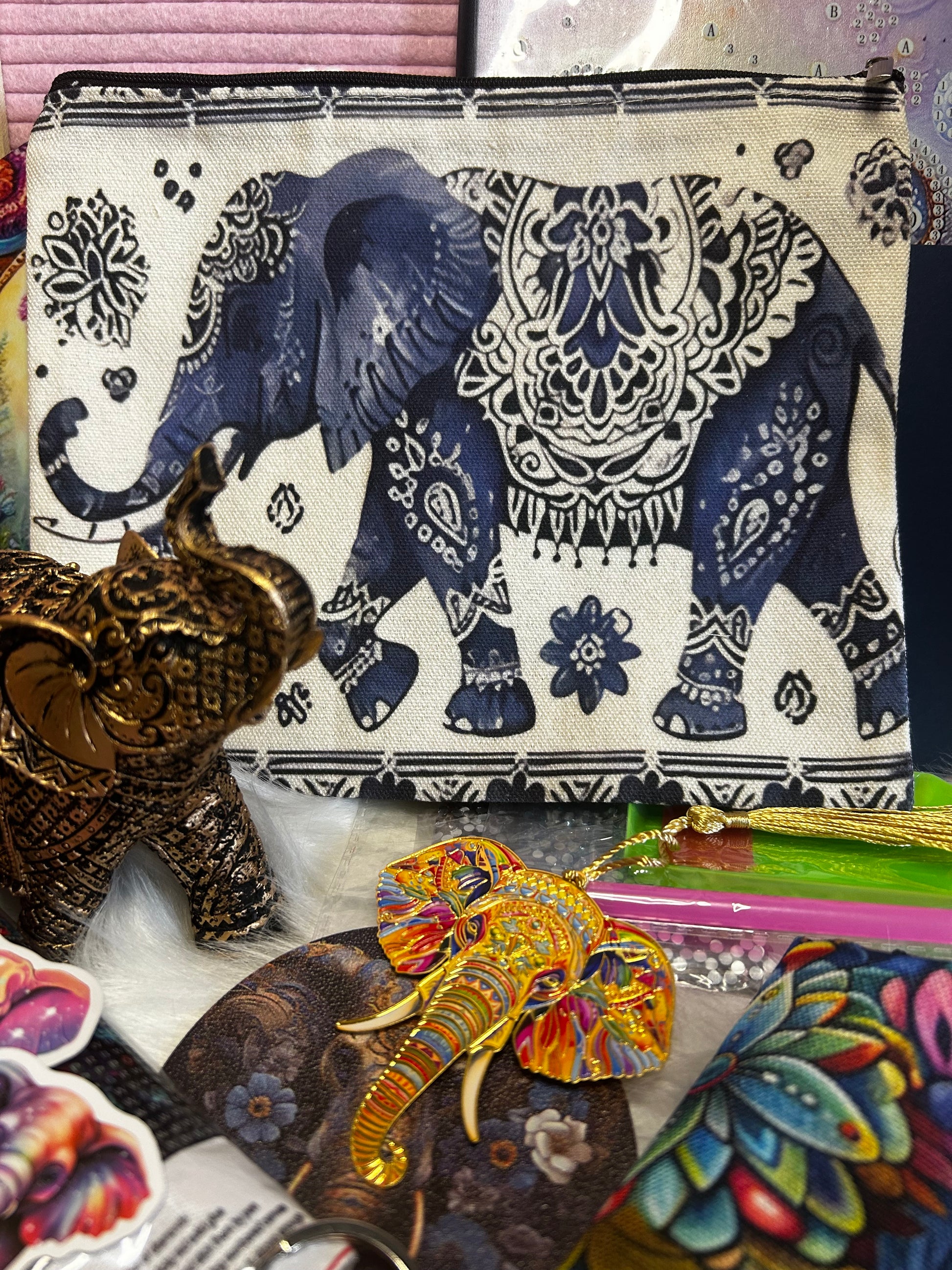 A mandala elephant themed bookish bundle in a blue multi-colour aesthetic. In your bundle you will receive a 20cm metal round decor, diamond painting notebook, 20cm diamond painting kit, pouch, mini drawstring bag, resin gold elephant figurine, tote bag, mini notebook, metal bookmark with tassel, 2 x sticky notes, 2 x pens, keyring, coaster & stickers.
