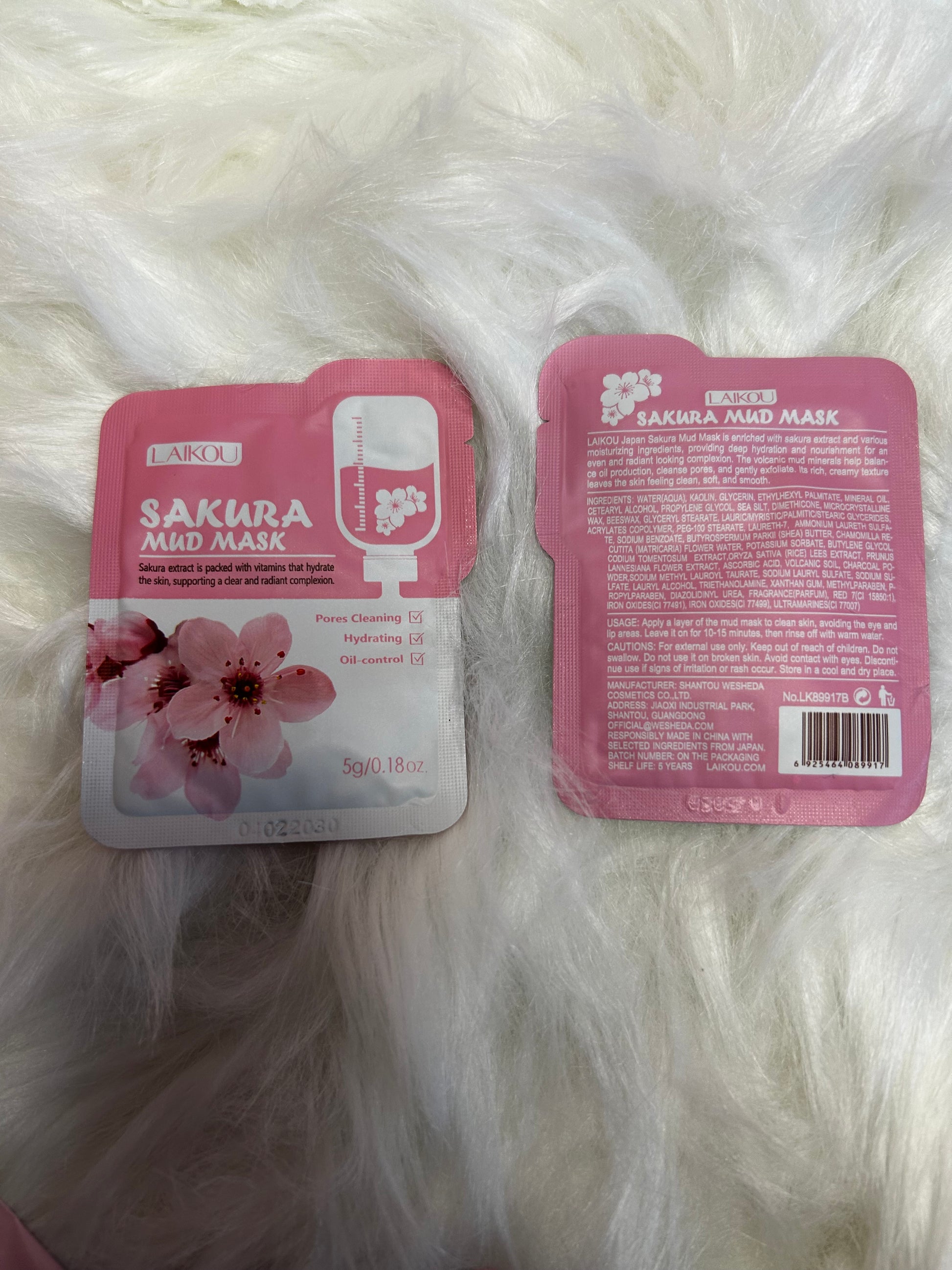 The petite pink gift bundle includes a herbal tea, reusable cleansing pad, 2 x mud masks, 2 x cherry blossom sleeping masks and 2 x sakura hand creams.