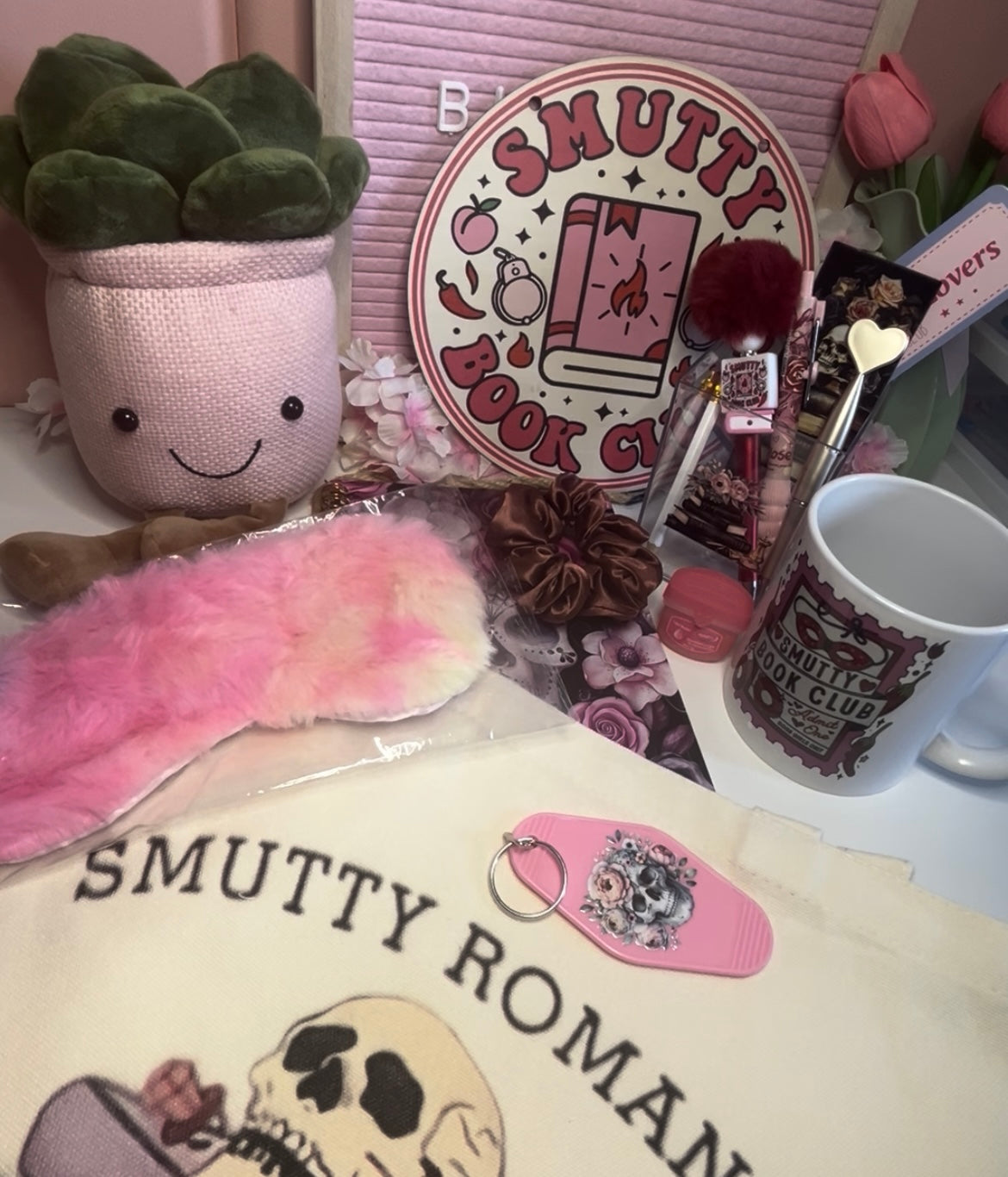 A bundle of items curated to a smutty book theme including tote bag, mug, handmade beaded pen and motel keychain.