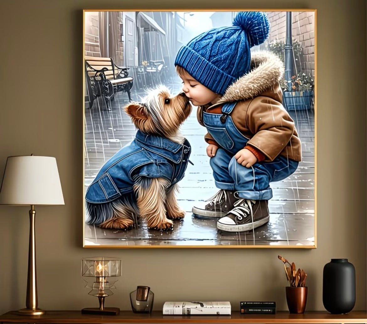 40x40cm Boy & Puppy in Rain Diamond Art Painting Kit