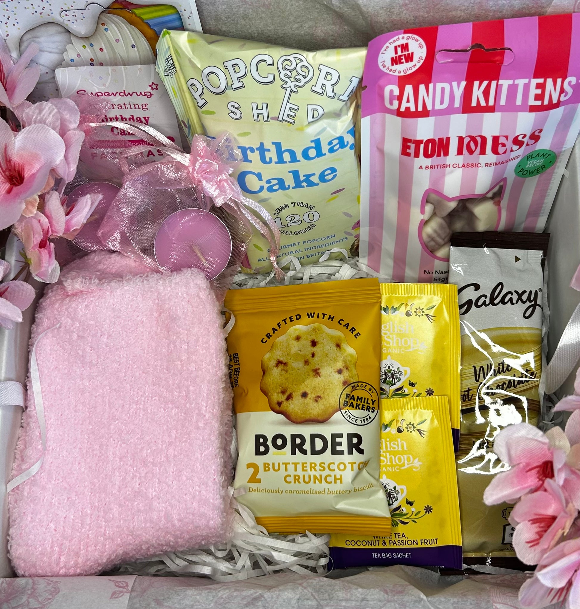 The Birthday Cake Gift Bundle comes gift wrapped in pink floral tissue paper & ribbon inside a white gift box. You will also receive a birthday cake hydrating clay mask, birthday cake popcorn, Eton mess fruit gums, pink fluffy socks, 2 pink tea light candles (unfragranced), 2 English Tea Shop enveloped tea bags, 2 Border Biscuits, Galaxy White Hot Chocolate Sachet & a birthday card.