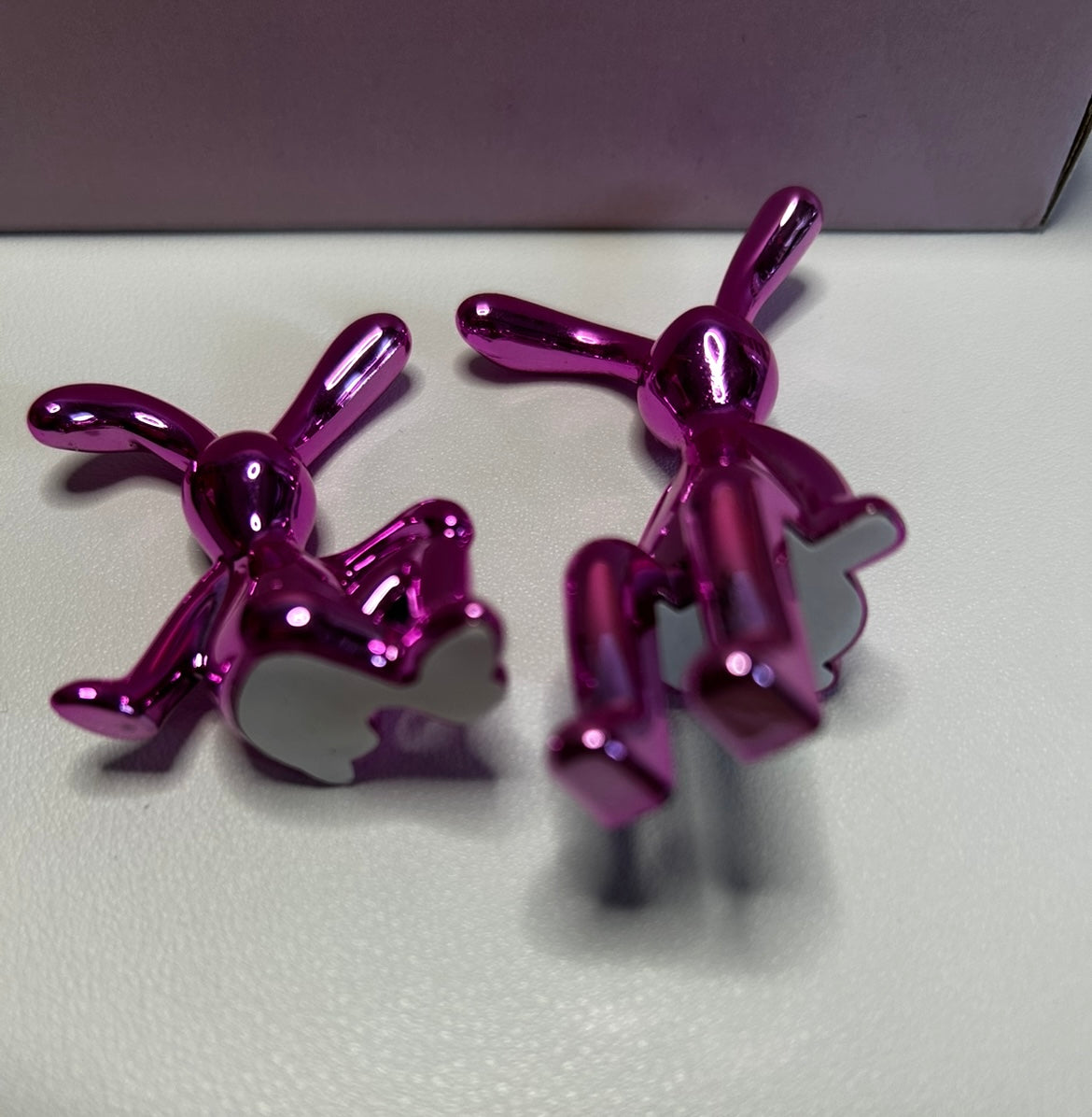 A cute pair of pink mini plastic rabbits that can be placed on shelves or around the home. They also have a sticky back underneath to help make them more secure.
