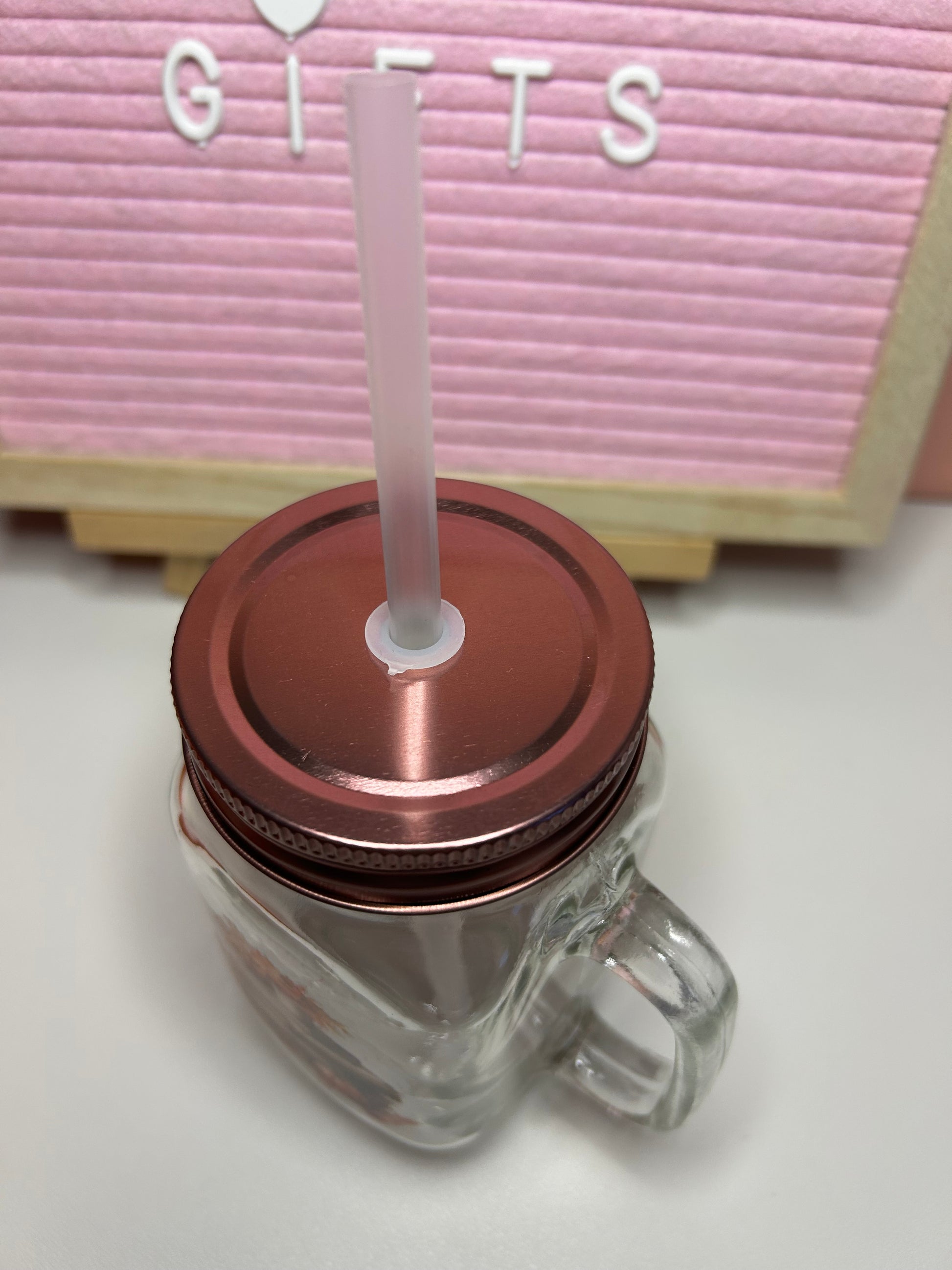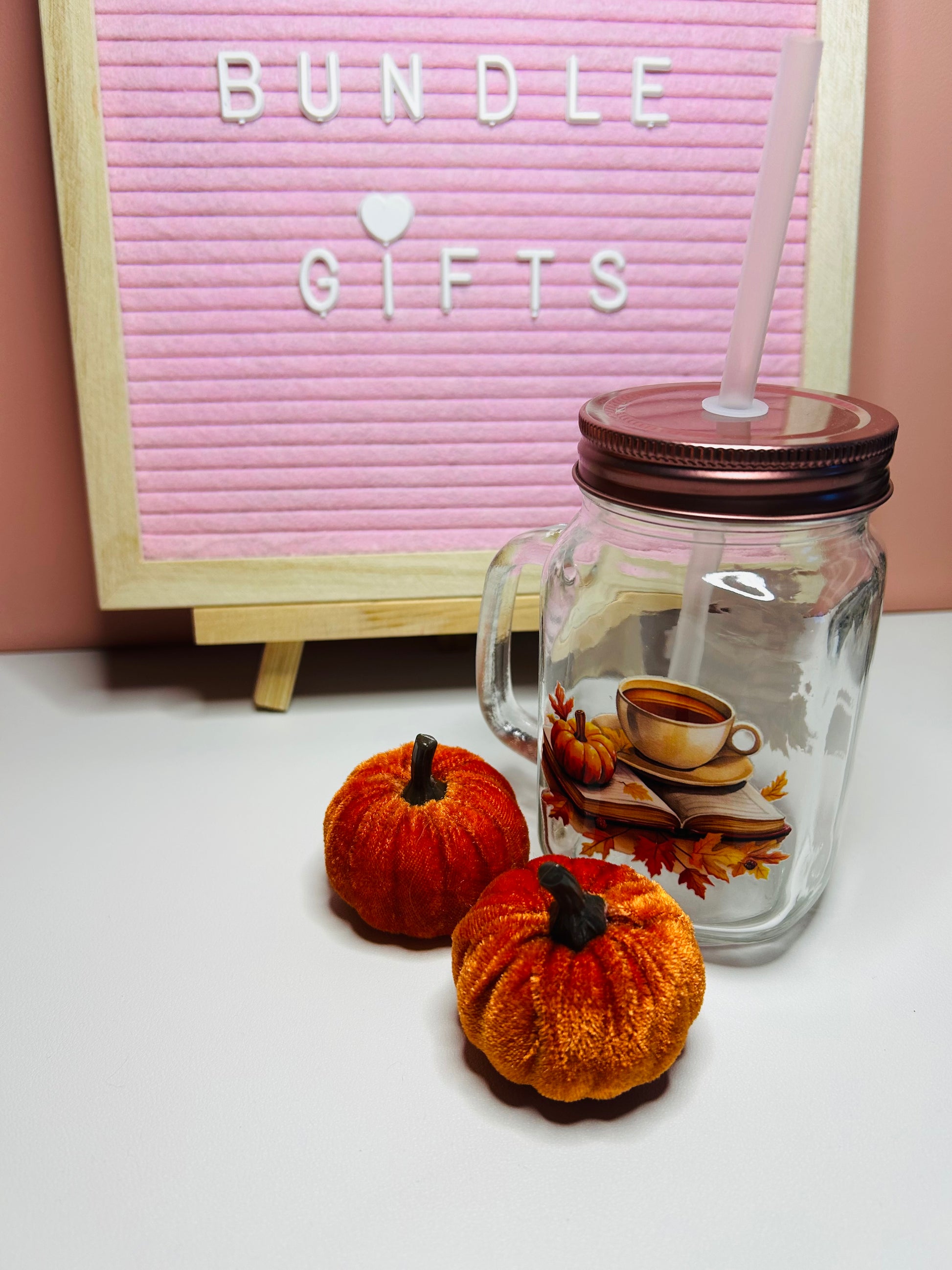 This is a handmade item using a glass mason jar with rose pink metal lid and an autumn themed uv-dtf design to decorate. It has a design on both sides of jar as shown in the images. With a pumpkin and book theme this would make a perfect accessory for snuggling up on the sofa with your new book and autumn inspired beverage.